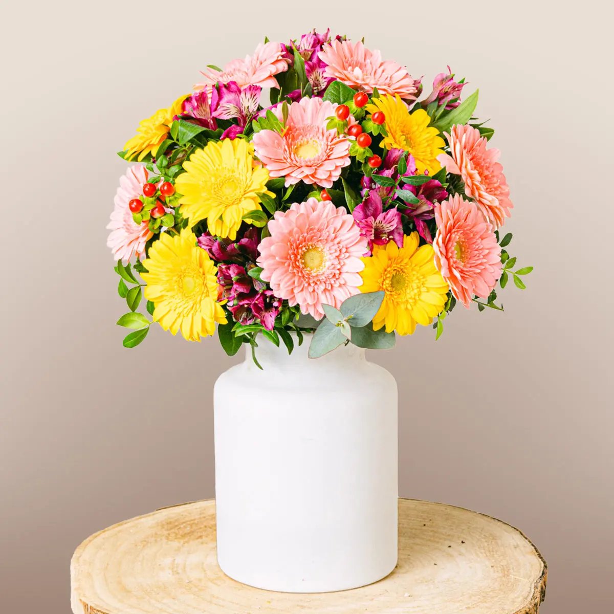 Want to know how to make a space both charming and relaxing? It’s this easy: simply place this beautiful bouquet of gerberas, alstroemerias and hypericum wherever you like and let its bright colors do the rest. Its pink and yellow tones will fill you with life.