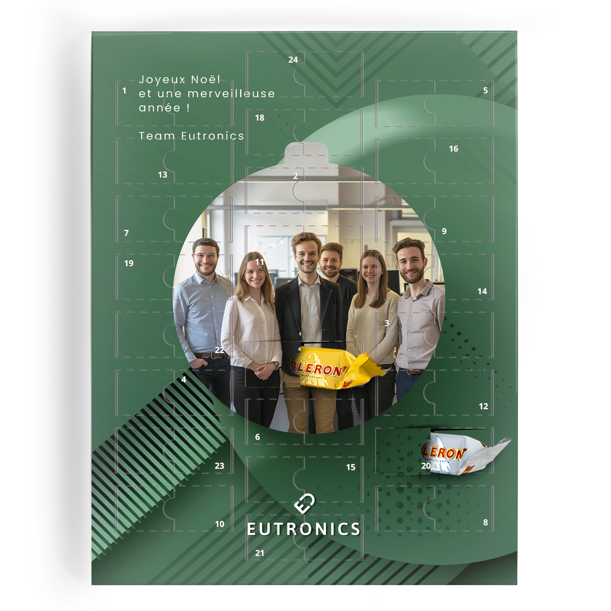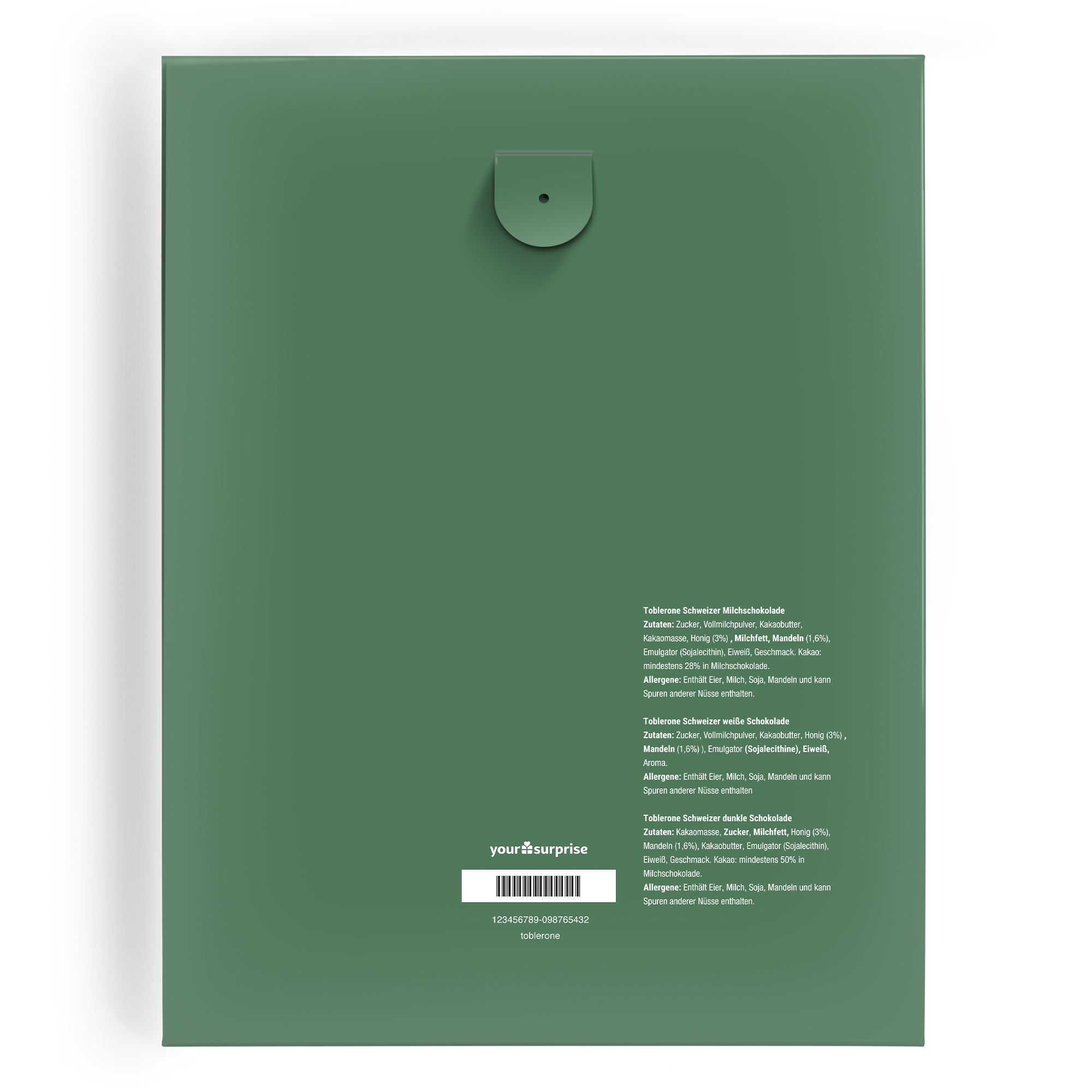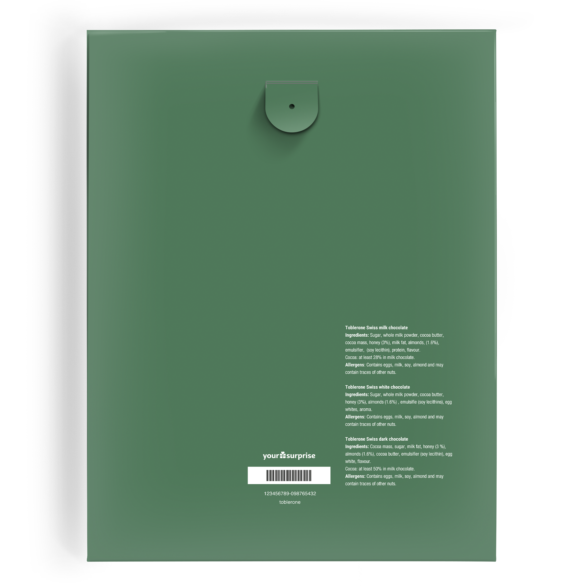 More information about the Toblerone Advent Calendar:Includes: 24 delicious Toblerone chocolates in milk, pure and whiteFilling: alpine milk, strawberry, hazelnut, cocoa creamDimensions: 23,7 x 30,5 x 2,5 cmNumber of days: 24 (1 to 24 December)Personalisation: with name, photo and/or logoPrinting: full colourSwiss milk chocolate TobleroneIngredients: Sugar, whole milk powder, cocoa butter, cocoa mass, honey (3%), milk fat, almonds (1.6%), emulsifier (soya lecithin), protein, flavouring.Cocoa: at least 28% in milk chocolate.Allergens : Contains egg, milk, soya, almond and may contain traces of other nuts.Swiss white chocolate TobleroneIngredients: Sugar, whole milk powder, cocoa butter, honey (3%), almonds (1.6%), emulsifier (soya lecithins), egg whites, flavouring.Allergens : Contains egg, milk, soya, almond and may contain traces of other nuts.Toblerone Swiss dark chocolateIngredients: Cocoa paste, sugar, milk fat, honey (3 %), almonds (1.6 %), cocoa butter, emulsifier (soya lecithin), egg white, flavouring.Cocoa: at least 50 % in milk chocolate.Allergens: Contains egg, milk, soya, almond and may contain traces of other nuts.Unfortunately, for technical reasons, it is not possible to process Cyrillic, Arabic, Asian, Greek or special characters.
