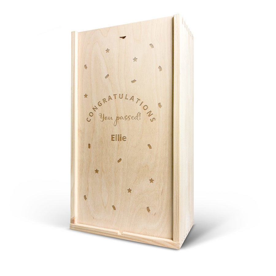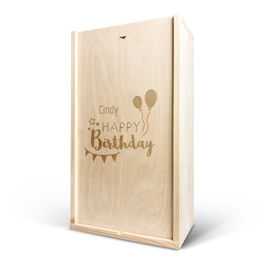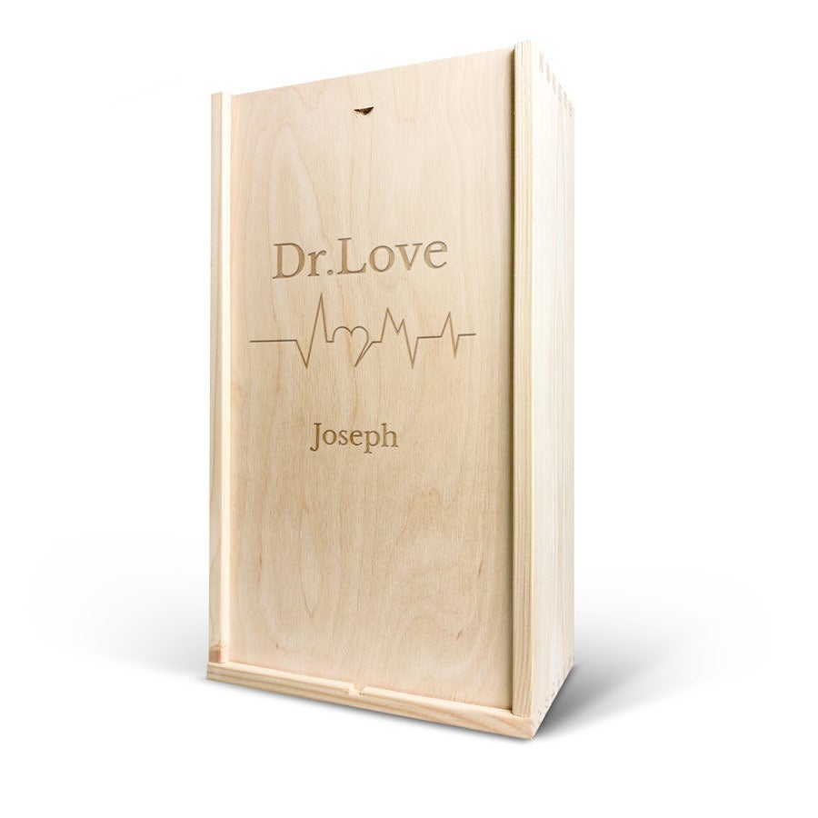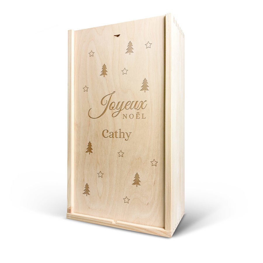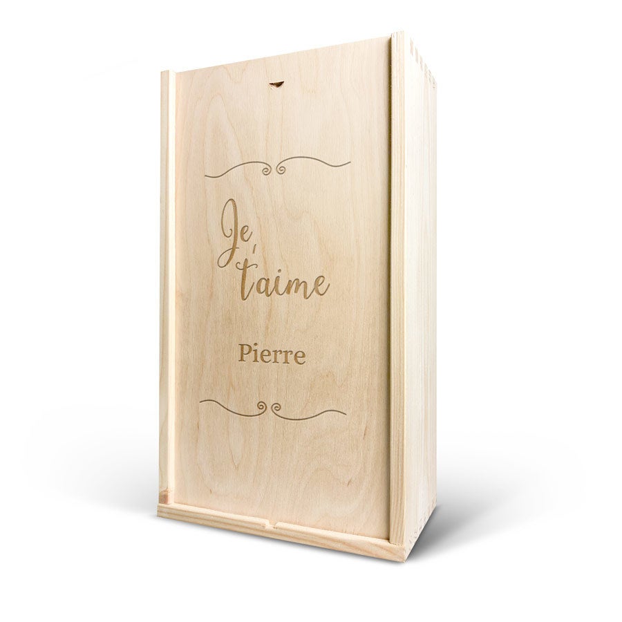 More information on the deluxe wooden case:Personalisation: with name and/or textPersonalisation placement: on the wooden case lidPersonalisation method: high-quality laser-engravingCase dimensions: 36,5 x 20,6 x 11 cmLid dimensions: 35,6 x 18,9 x 0,3 cmAdditional information: The wooden case is made with FSC-certified wood. More information on the wine:Brand: Maison de la SurpriseContents: 750 mlCountry of origin: FranceMaison de la Surprise whiteGrape: ChardonnayCharacter: Maison de la Surprise Chardonnay has notes of jasmine, white peach and citrus. Pairs well with salads and seafood. Maison de la Surprise redGrape: MerlotCharacter: Maison de la Surprise Merlot has notes of dark fruit and a hint of vanilla. Pairs well with poultry and roasted meat.