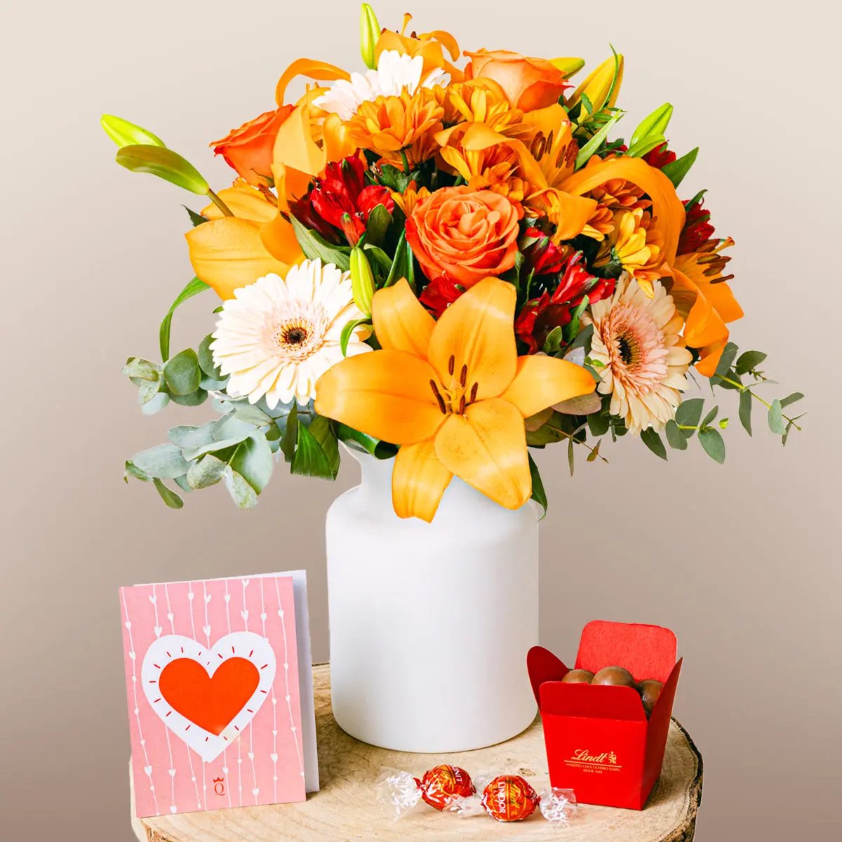 Roses, Lilies, Gerberas, Chrysanthemums, and Alstroemerias in shades of orange and peach.