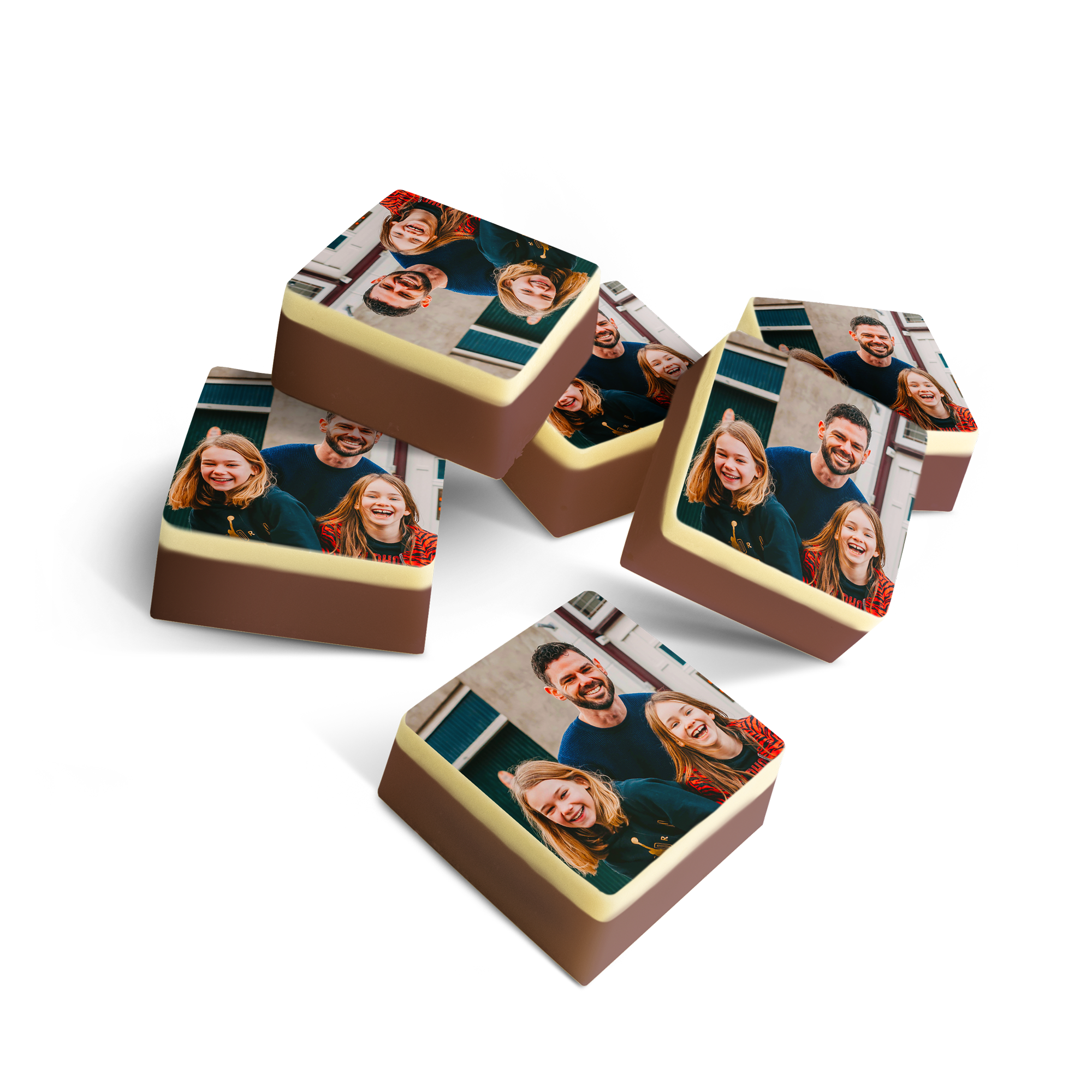 - 12 Chocolates cuadrados: Cada uno con la posibilidad de ser personalizado con una foto o logotipo, ofreciendo un regalo único y original.