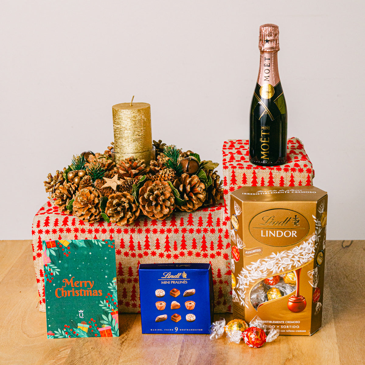 Componentes: Mini Moët Rosé (20cl), Mini Pralinés Lindt (44g), Lindor Cornet (337g), una corona festiva como centro de mesa con follaje real y una tarjeta personalizada.