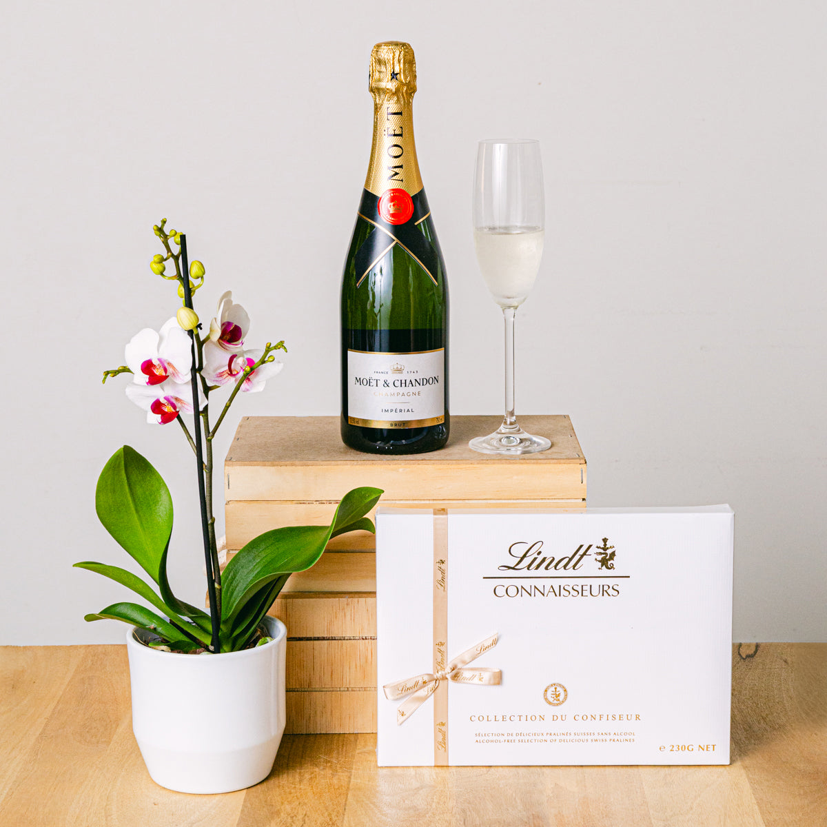 La combinación de una delicada orquídea, un champagne de renombre y exquisitos chocolates suizos crea una experiencia de regalo única e inolvidable, perfecta para celebrar momentos especiales con un toque de lujo y sofisticación.