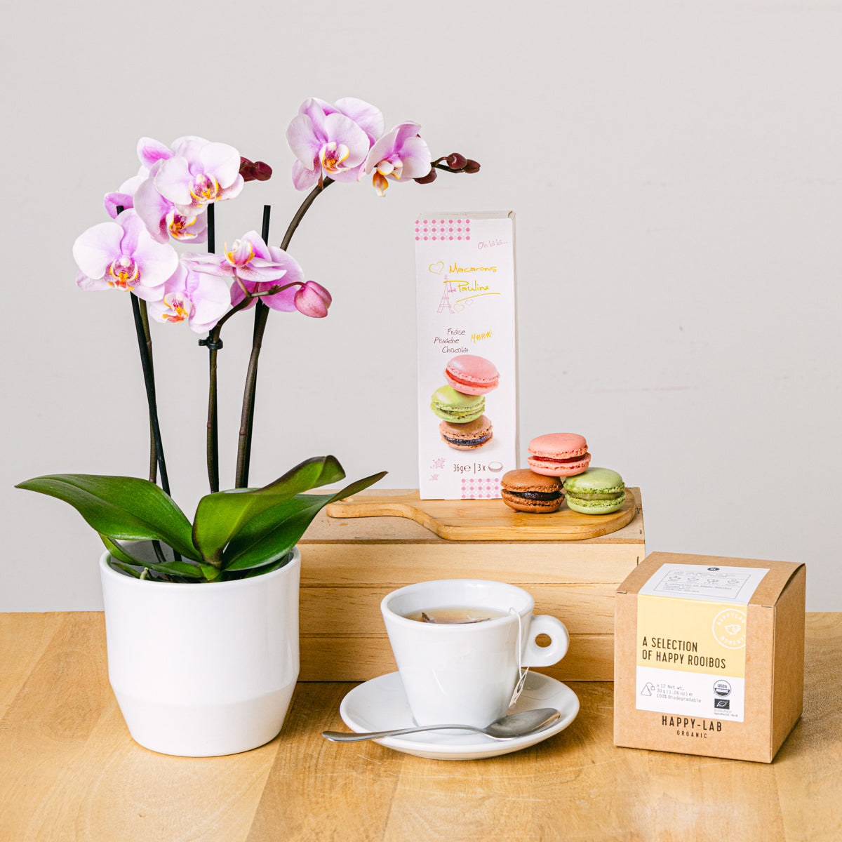 Características Únicas: La combinación de la belleza de la orquídea, el sabor del té y la exquisitez de los macarons crea una experiencia sensorial completa, un regalo que alimenta el alma y el espíritu.
