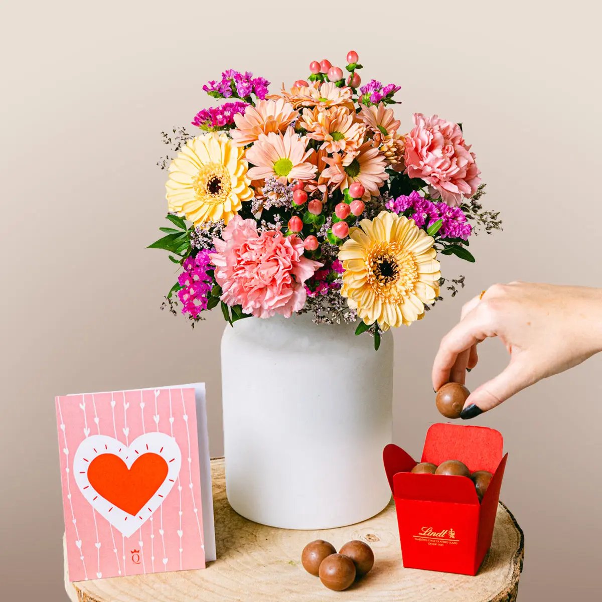 Sus colores vibrantes irradian felicidad y energía, perfecto para levantar el ánimo. Este ramo es un recordatorio de la belleza simple de la vida, ideal para celebrar momentos especiales.