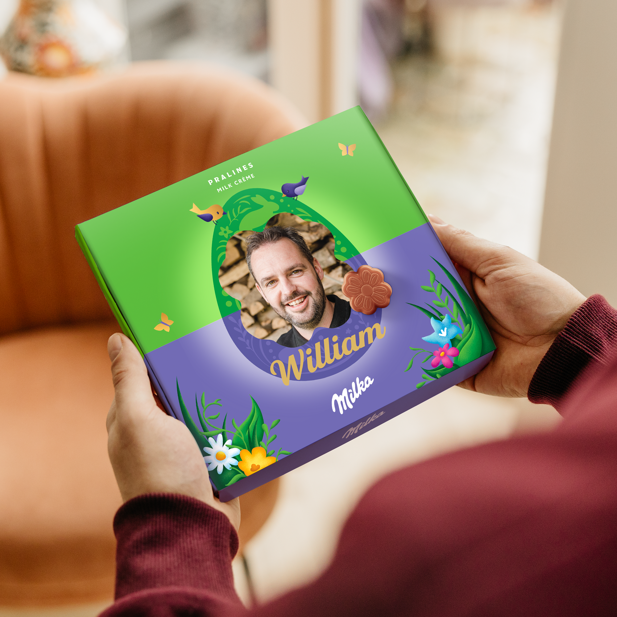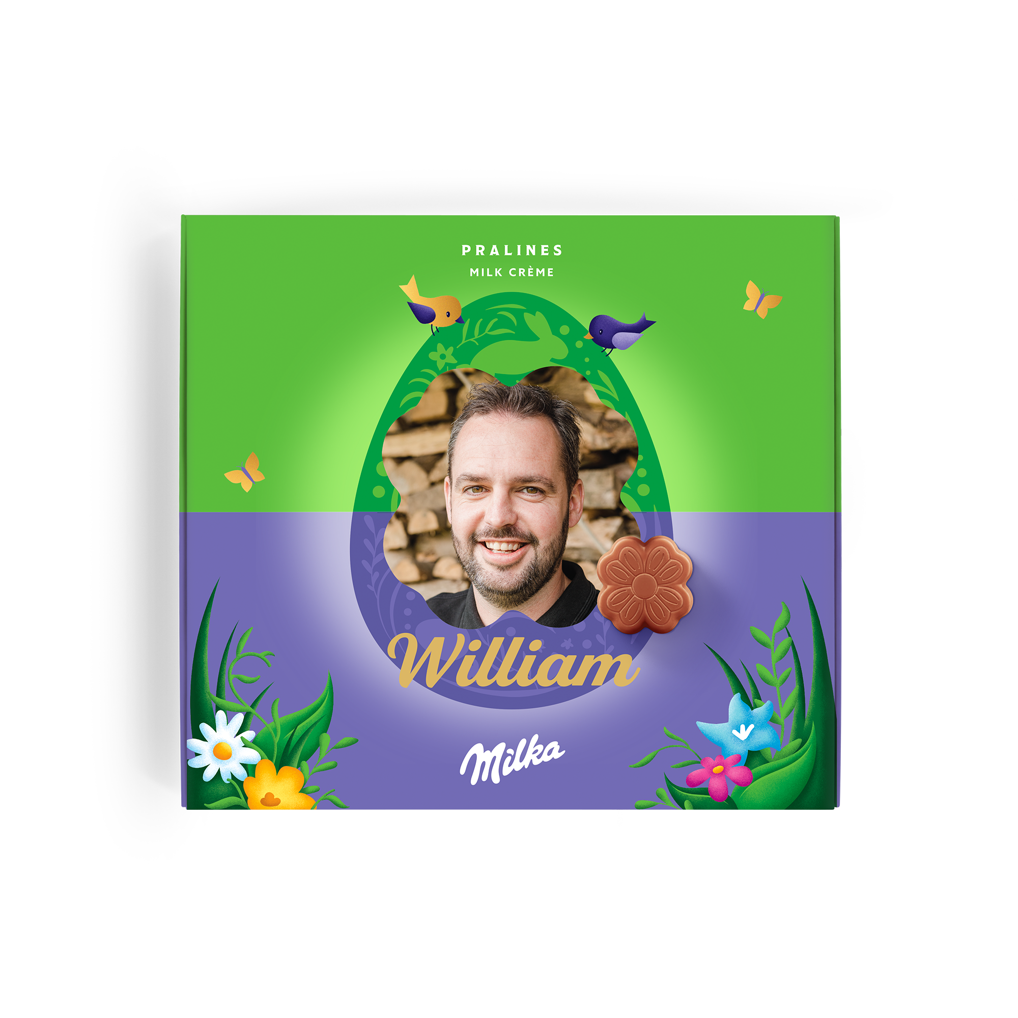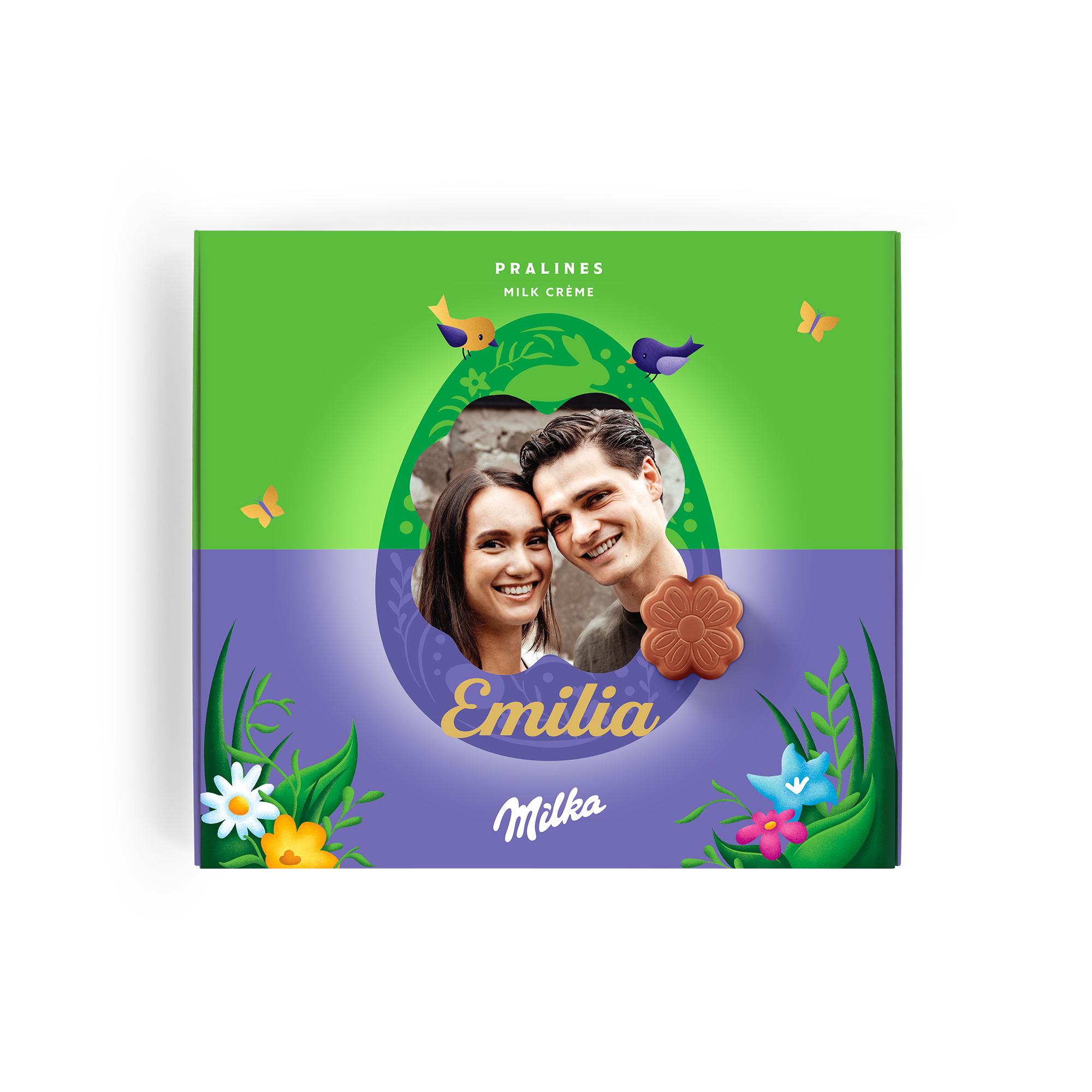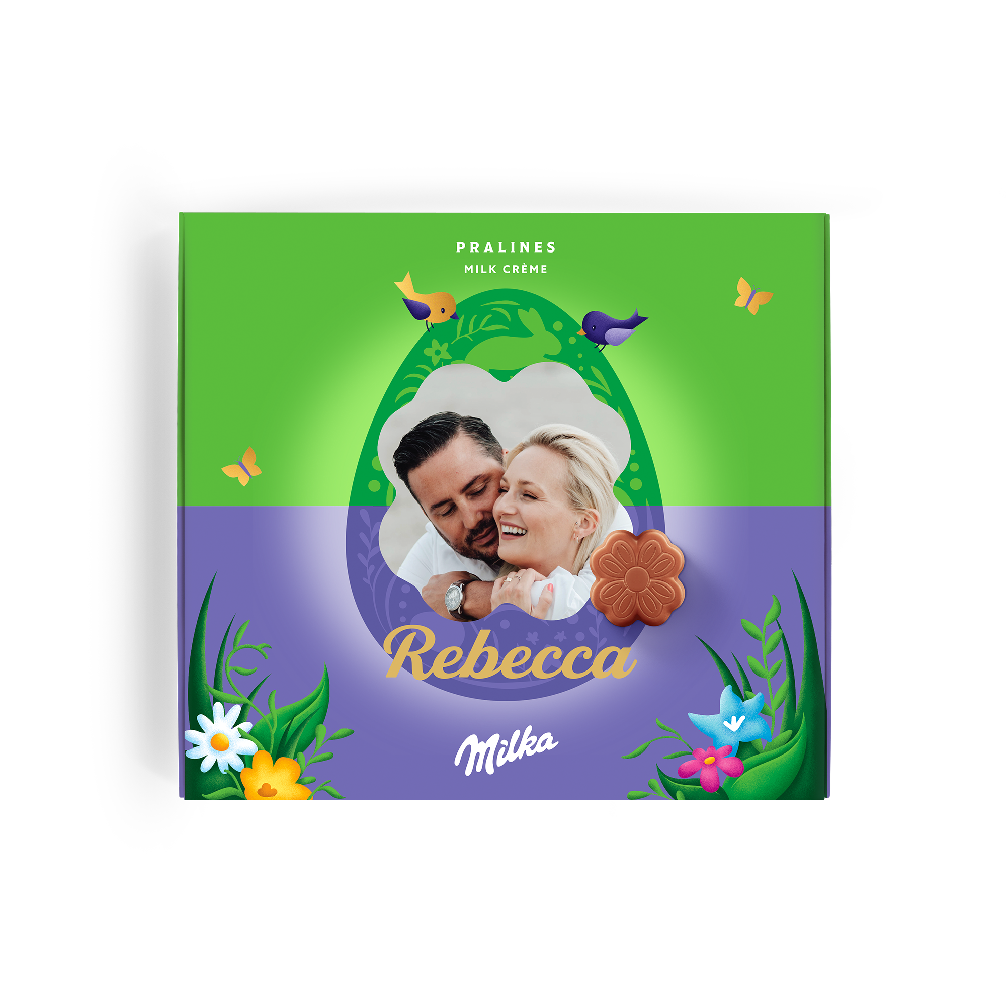 Caja especial de chocolate Milka para Pascua. Deliciosos pralinés con nombre, foto y un mensaje personal. ¡Sorprende a tus seres queridos!