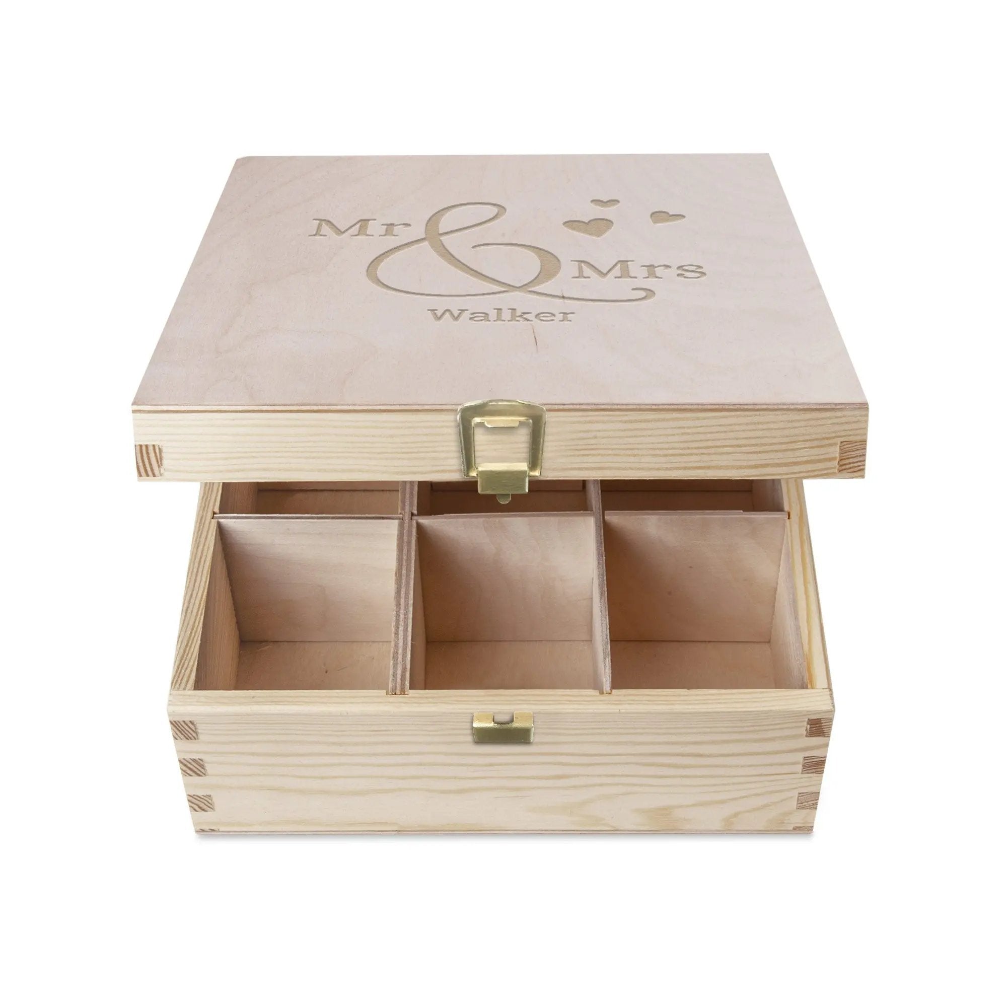 More information on the wooden tea box with name:Material: beautiful European beech woodDimensions: 20,8 x 24 x 9,8 cmCompartments: 9Personalisation: with name or textPersonalisation method: high quality laser engravingEngraving colour: brown (wood colour)Extra: Wood is a natural product, which means your gift may differ slightly from those pictured on the website.Good to know:The tea box has a number of interchangeable partitions. This means you could also place your favourite tea spoons in the box, for example. If you would like to have a logo engraved on the lid, please contact customer service for further information.