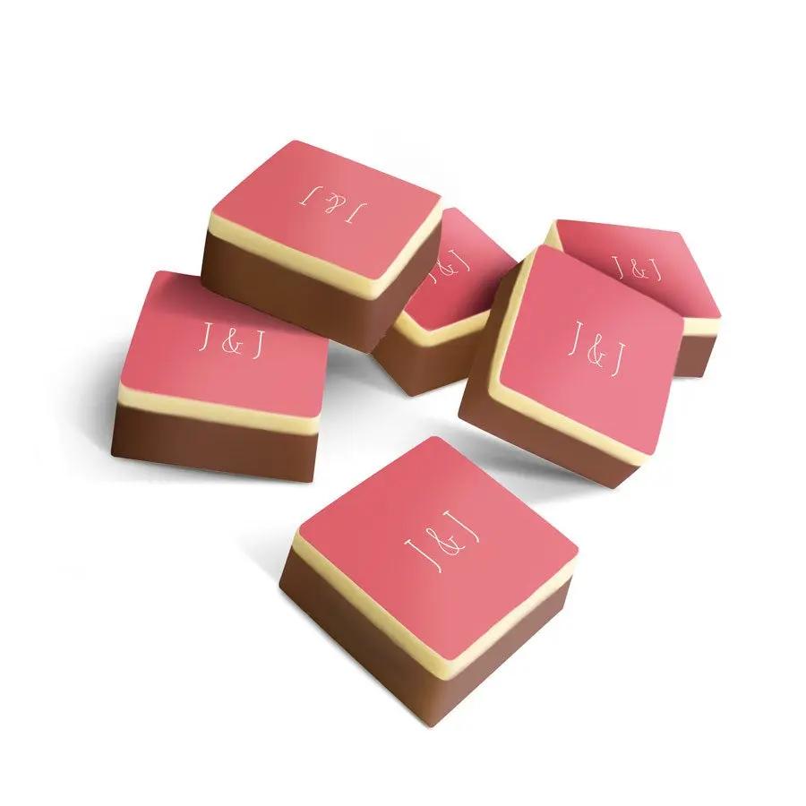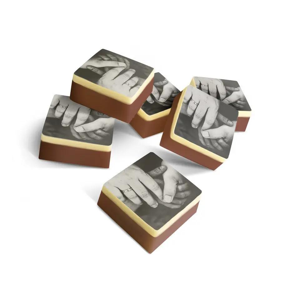 Chocolates cuadrados de leche con capa de chocolate blanco personalizables con fotos o logos, ideales para cumpleaños, aniversarios y eventos especiales.