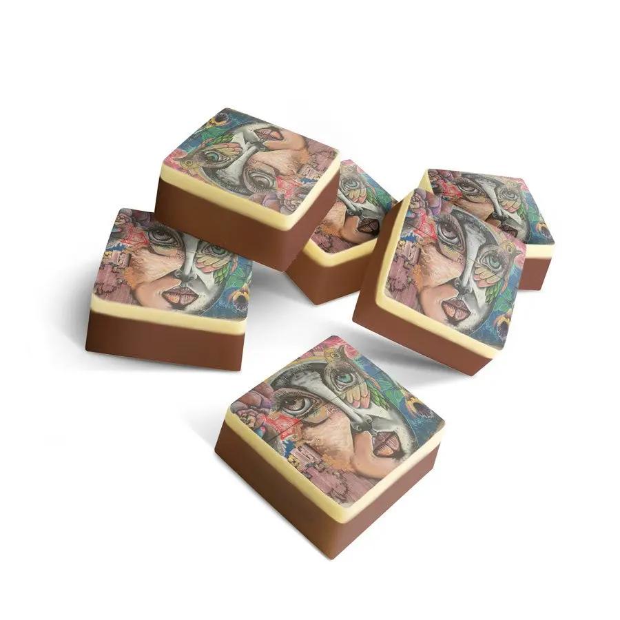 Experiencia Completa: 24 chocolates cuadrados de leche con capa de chocolate blanco, impresión comestible a todo color, presentación cuidada.