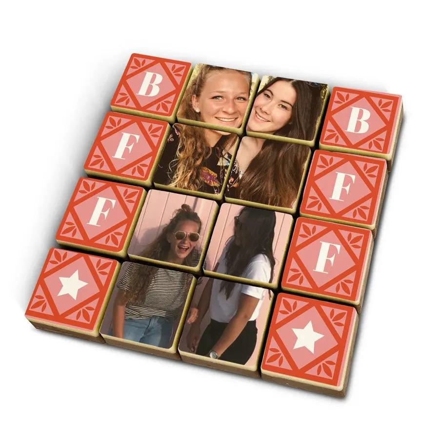Experiencia Completa: 16 bombones de chocolate con leche y capa de chocolate blanco, impresión comestible a todo color, empaque elegante y listo para regalar.