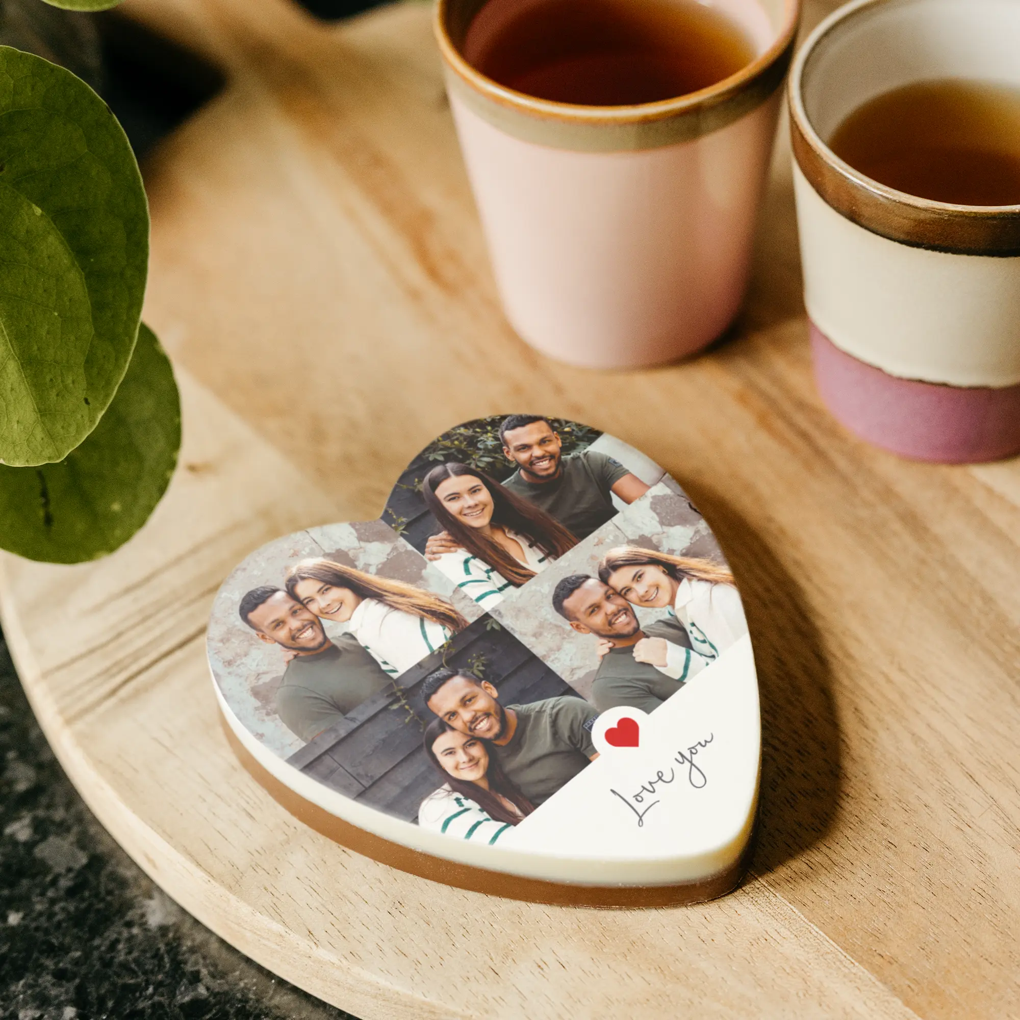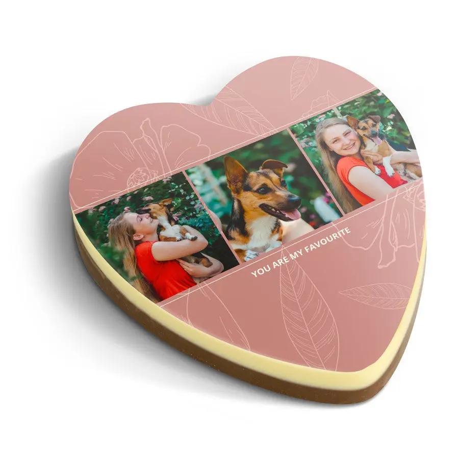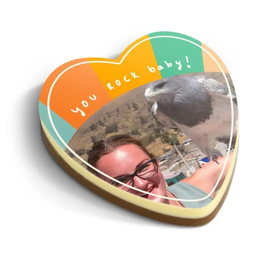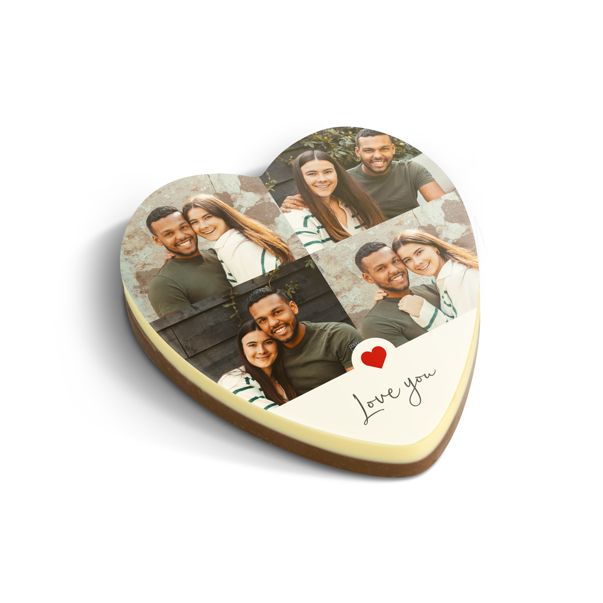 Experiencia completa: Corazón de chocolate con leche y capa de chocolate blanco personalizable con foto, logo o texto. Impresión comestible a todo color.