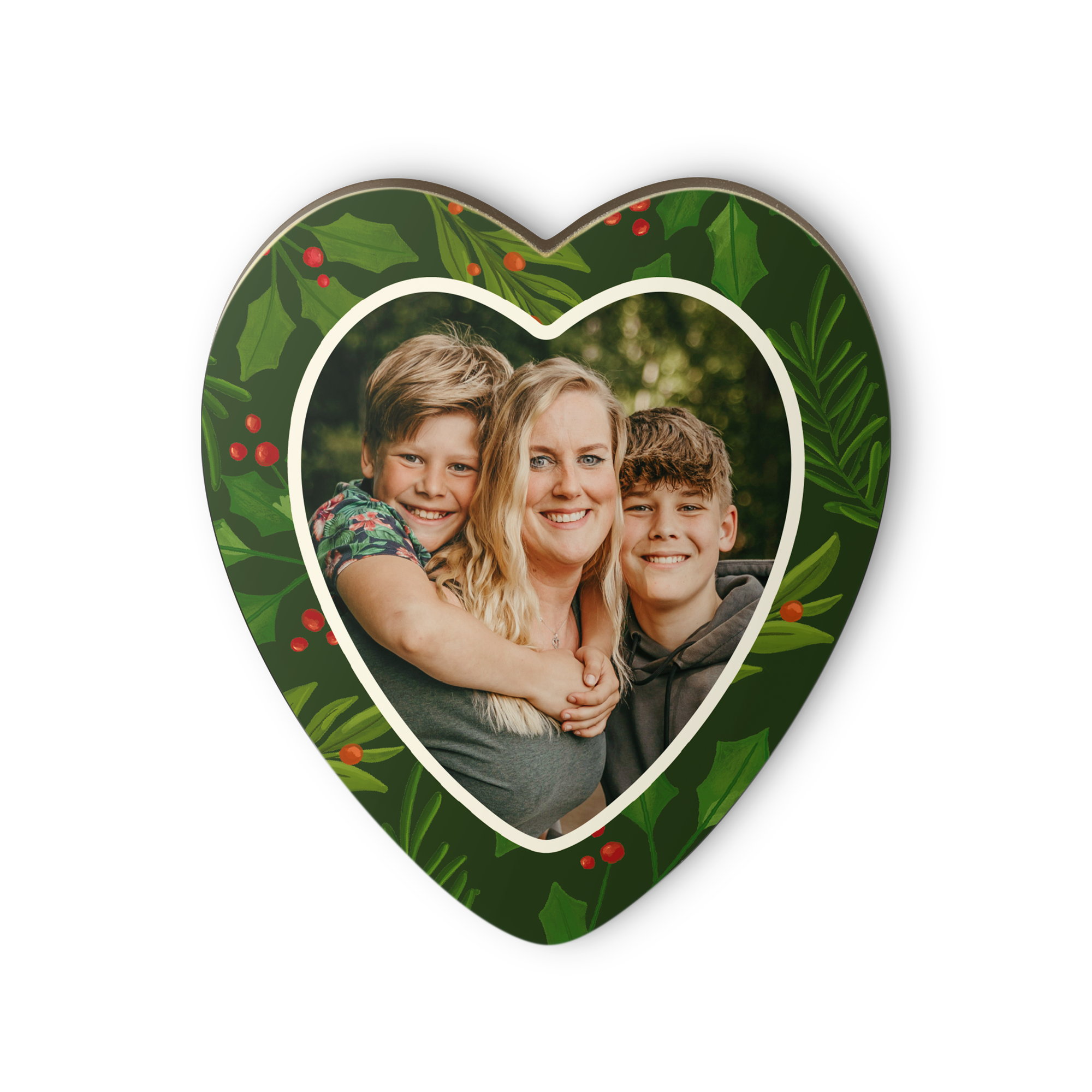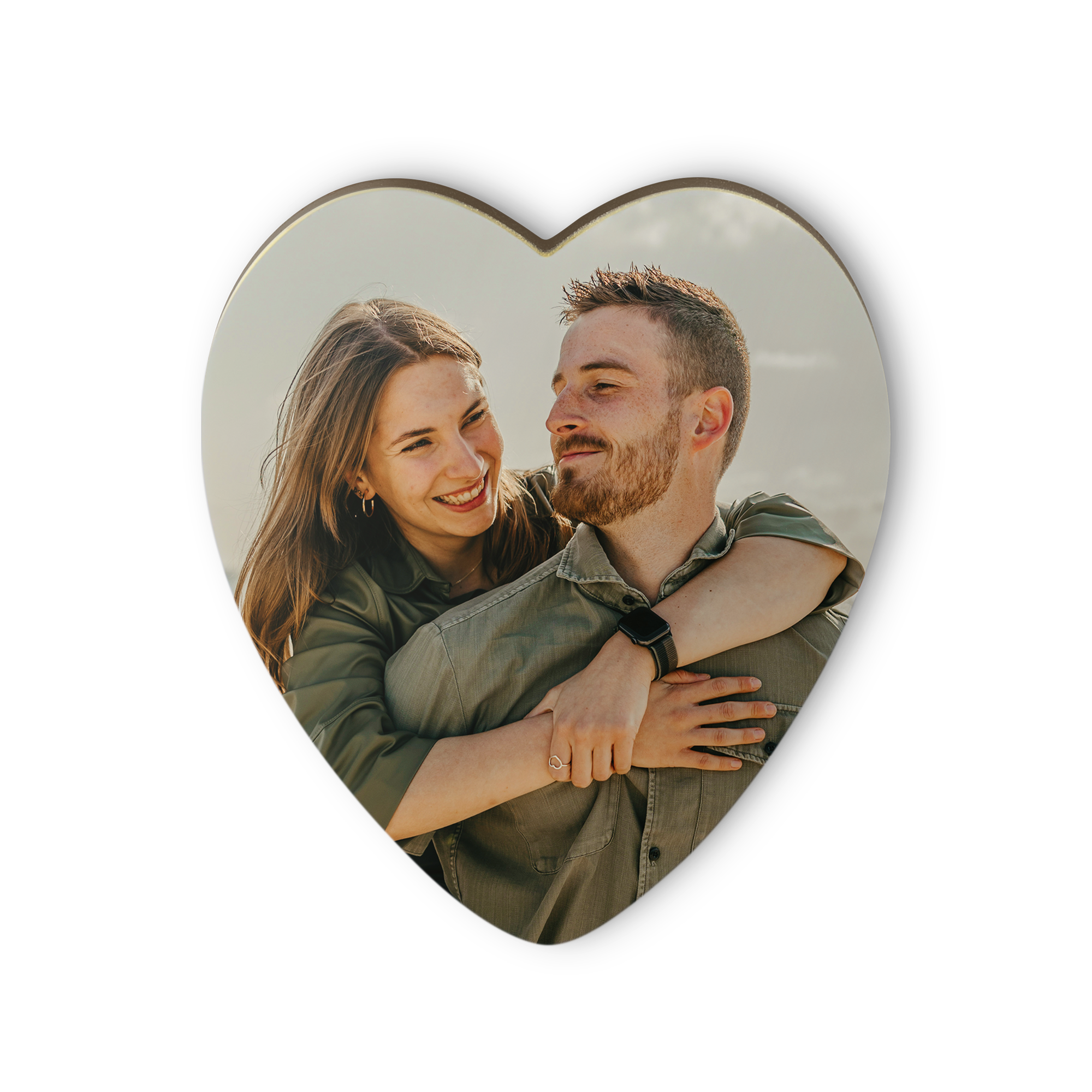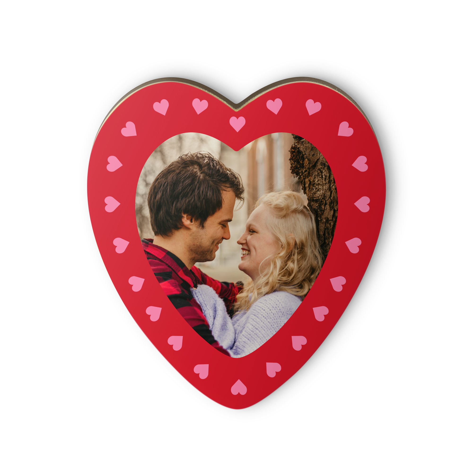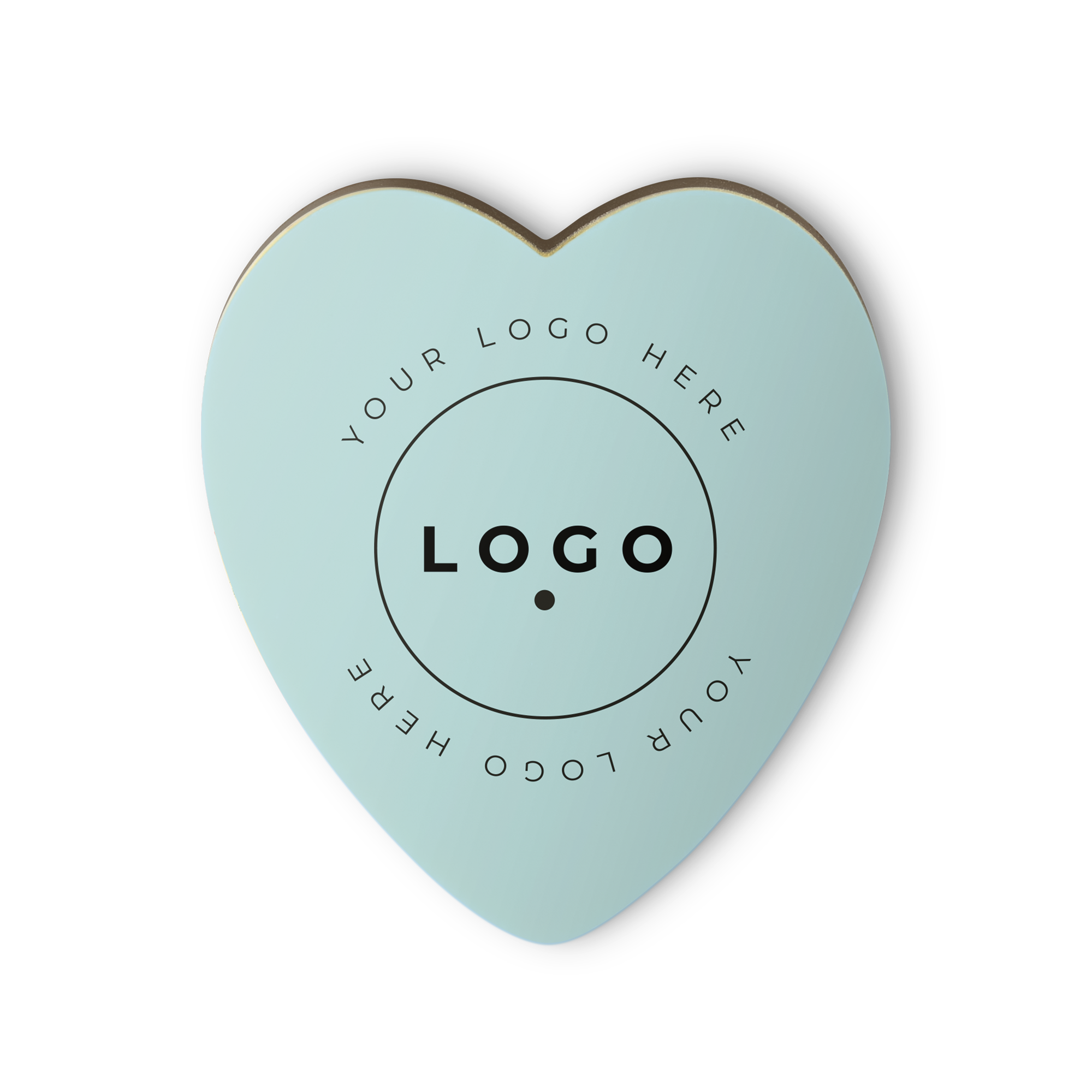 Experiencia completa: Corazón de chocolate con leche y capa de chocolate blanco personalizable con foto, logo o texto. Impresión comestible a todo color.