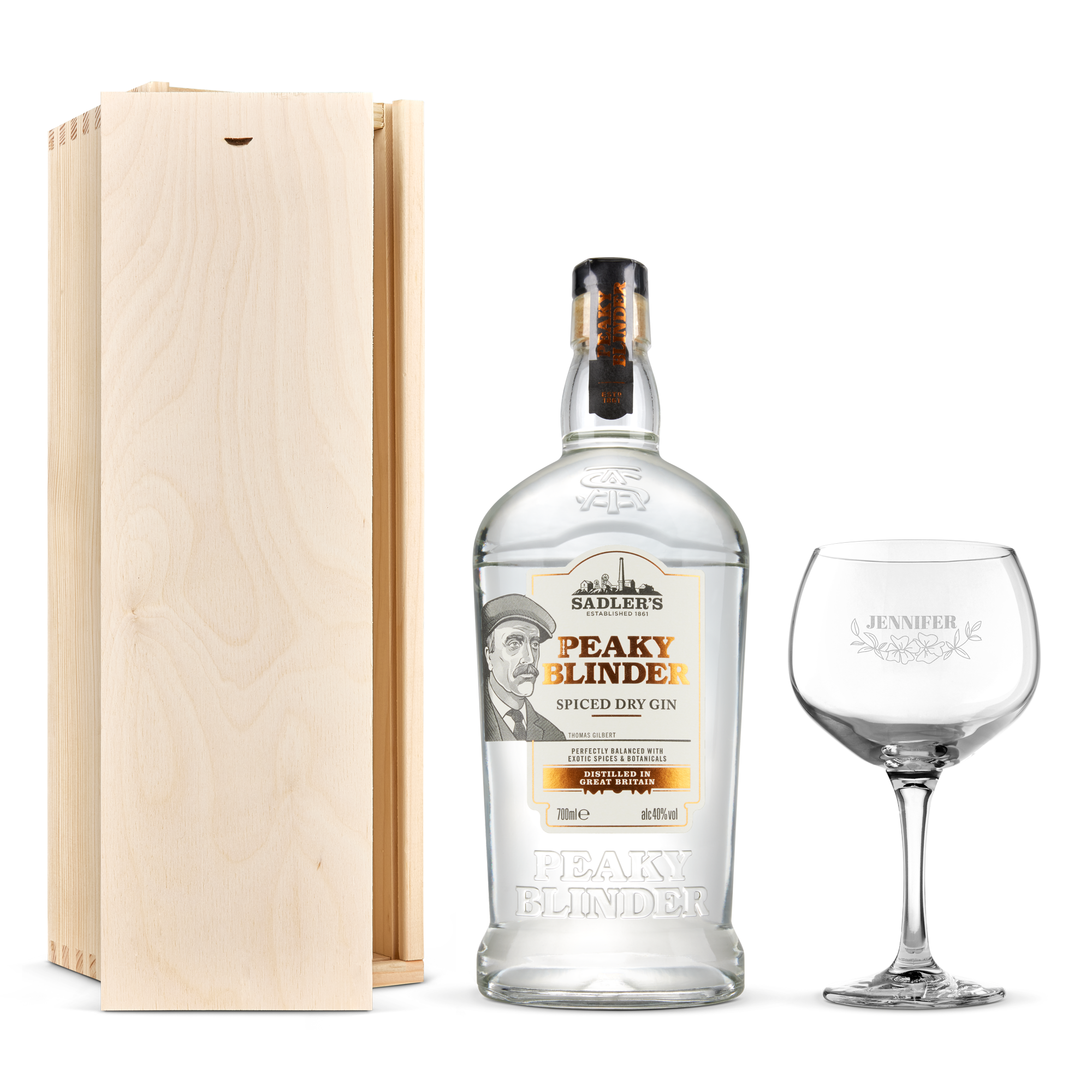 Experiencia Completa: Ginebra Sadler's Peaky Blinder (700 ml, 40% vol), vaso de gin-tonic con grabado láser de alta calidad, estuche de madera FSC-certificado (36.5 x 12 x 11 cm).
