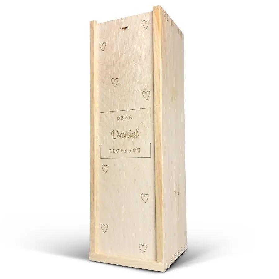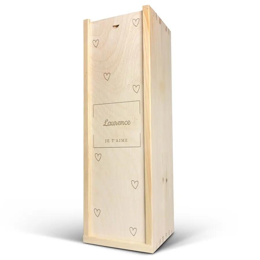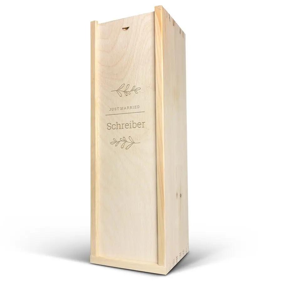 Una deliciosa botella de champán real Moët & Chandon en una caja de madera personalizada con tu nombre o texto. ¡Varios tamaños de botellas disponibles!