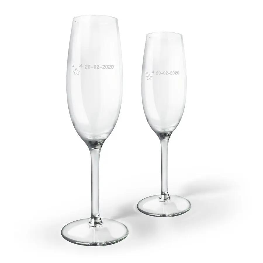 Información sobre las copas de champán:Cantidad: 2 piezas  Marca: Royal Leerdam  Tipo: L'esprit  Altura: 21.5 cm  Contenido: 21 cl  Más información sobre el champán:Nombre: Moët & Chandon Tipo de vino: espumoso @Contenido: 750 ml  País el origen: Francia  Variedad de uva: Pinot Noir, Chardonnay, Pinot Meunier