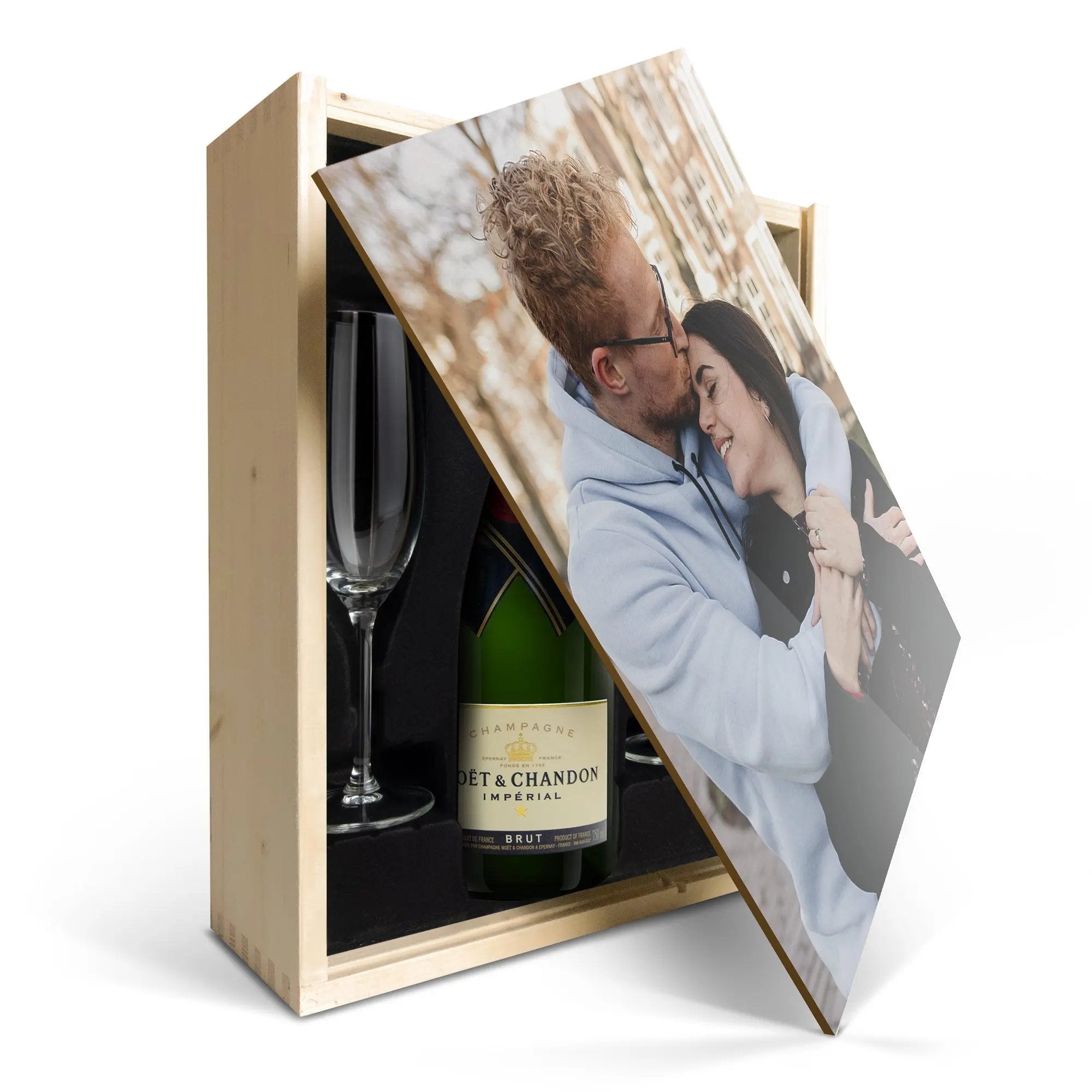 Champagne Moët & Chandon (750 ml), dos copas Royal Leerdam L'esprit (21 cl), estuche de madera personalizado con foto/texto.