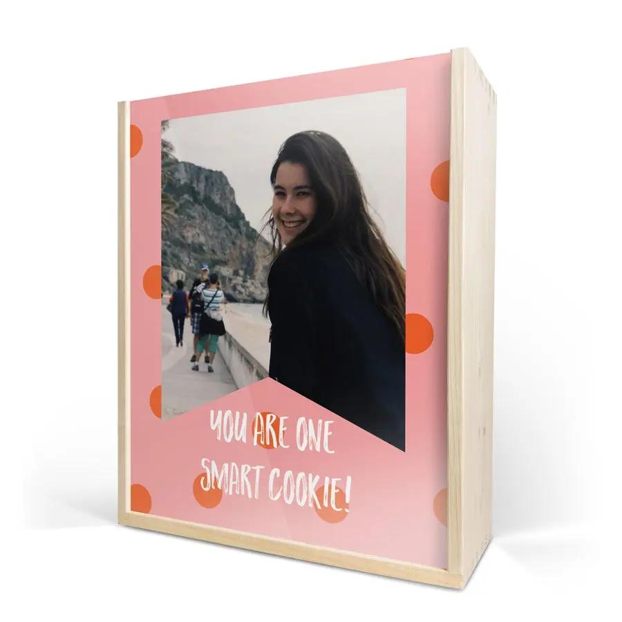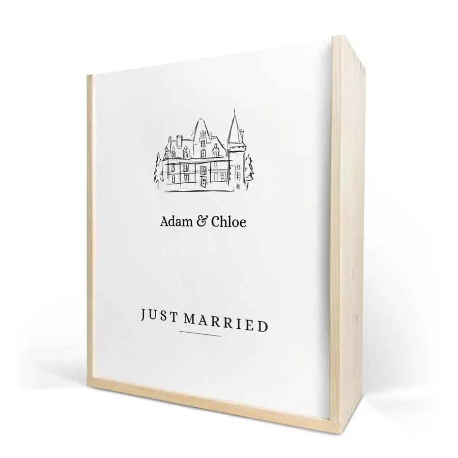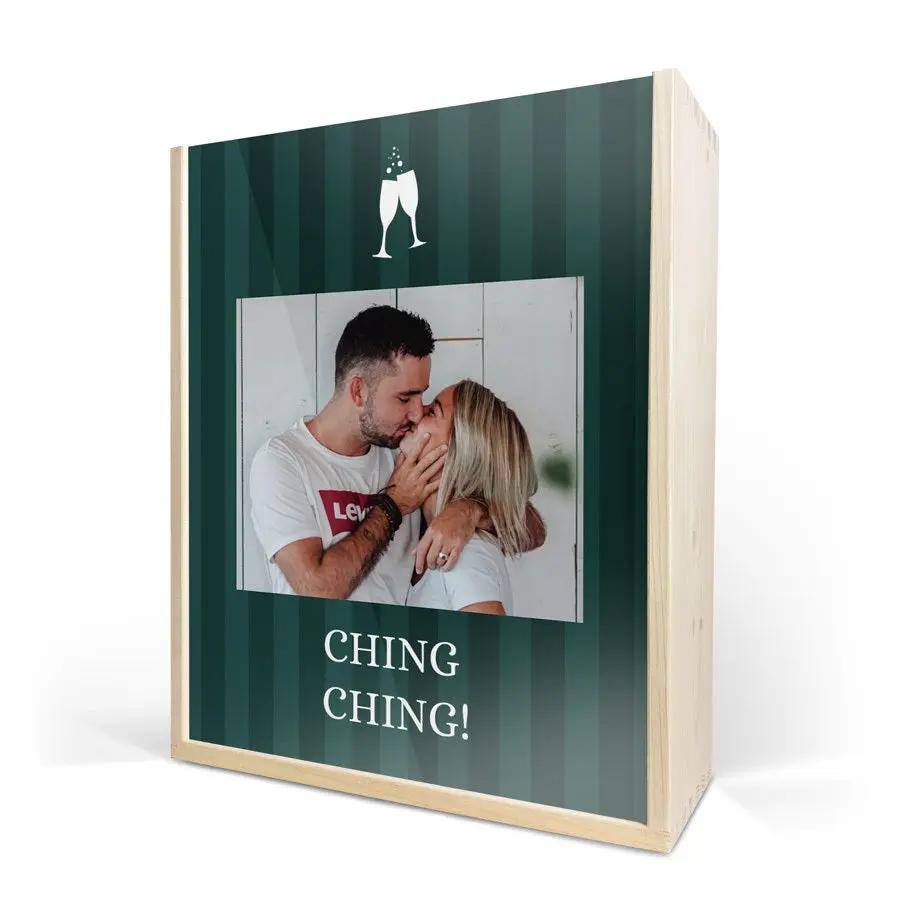 Una exquisita botella de champán Moët & Chandon con dos copas. En un lujoso estuche de madera personalizado, con tu diseño. ¡Salud!