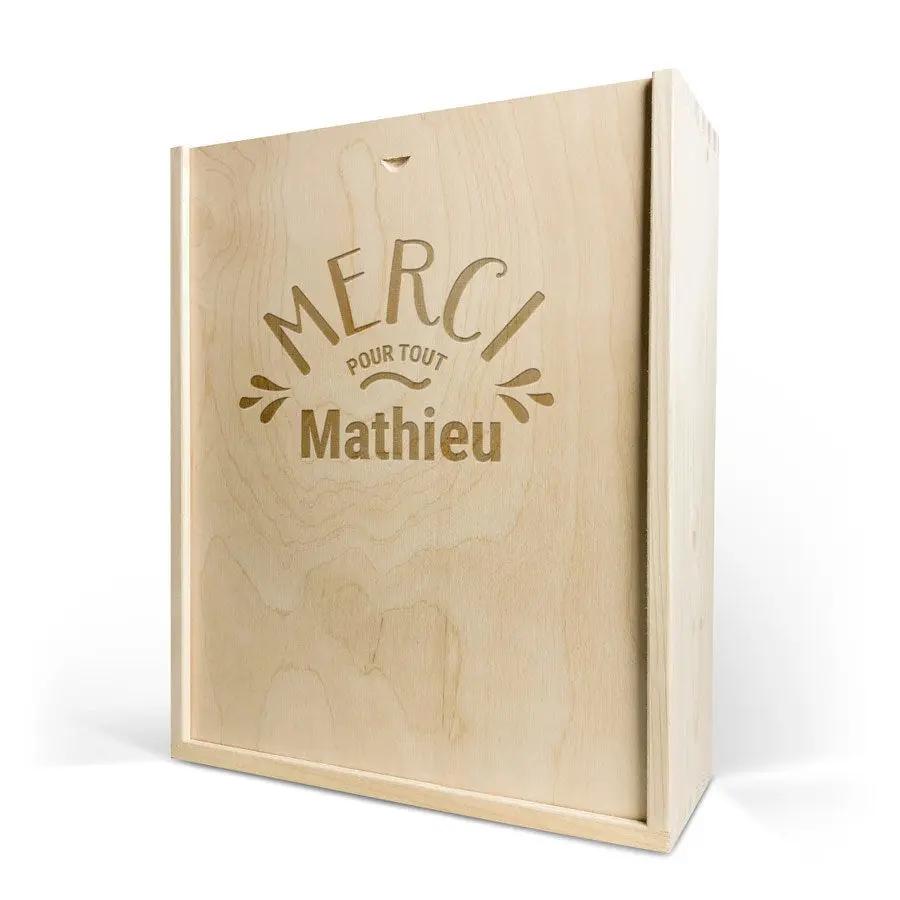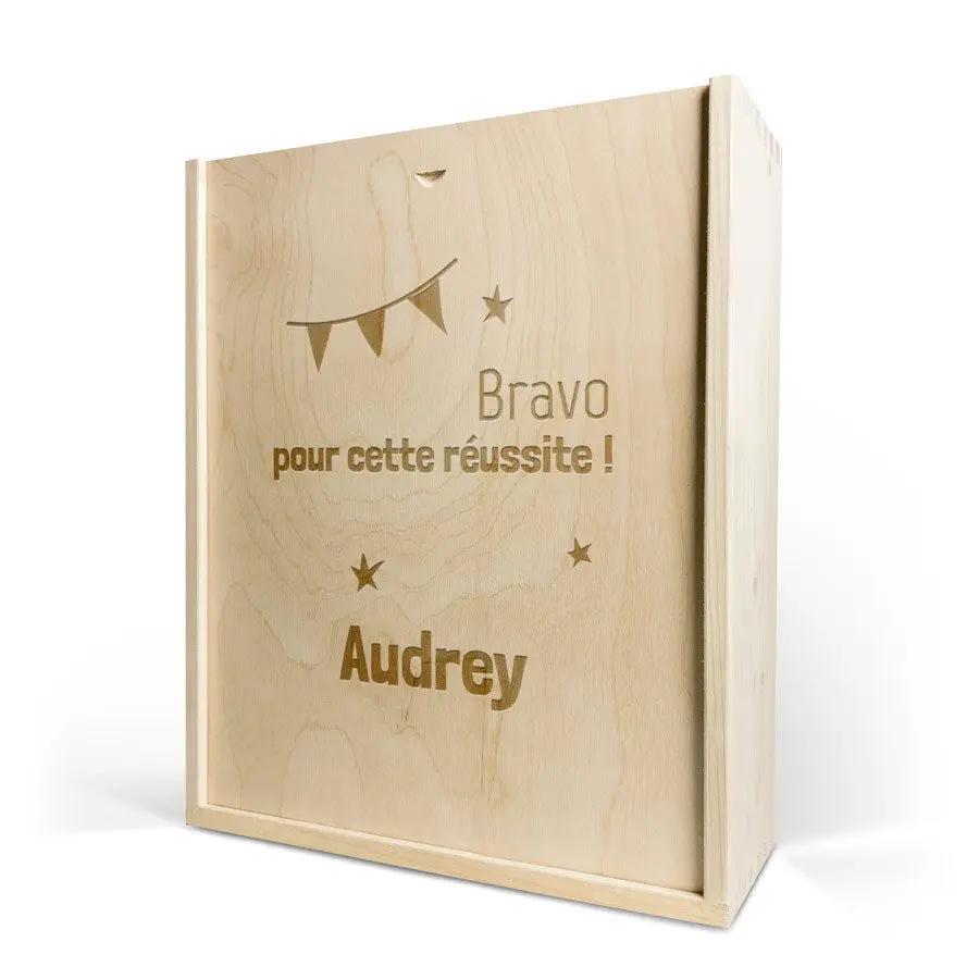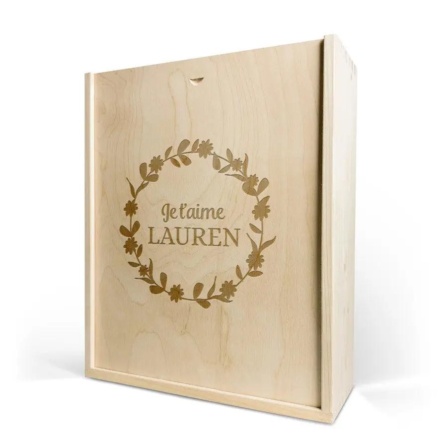 Una deliciosa botella de champán Moët & Chandon con dos copas. En una lujosa caja de madera grabada, con tu diseño. ¡Salud!