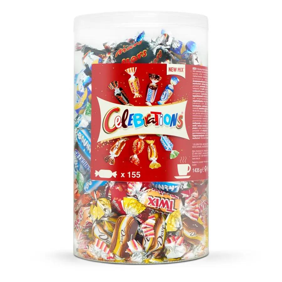 Más información sobre el tubo Celebrations:Contenido: surtido de chocolates con relleno de chocolate con leche, galleta de chocolate y barquillos de chocolate con leche.Peso: 312 gramosDimensiones del tubo: 29,8 x 9,2 cmDimensiones de la caja de regalo: 30 x 9,7 cmPersonalización: foto, texto y/o logotipoImpresión a todo color de alta calidadInformación adicional: en lugares con temperaturas que alcanzan o superan los 25 °C, desafortunadamente no es posible garantizar el estado del chocolate.por razones técnicas, solo es posible usar letras y guiones.