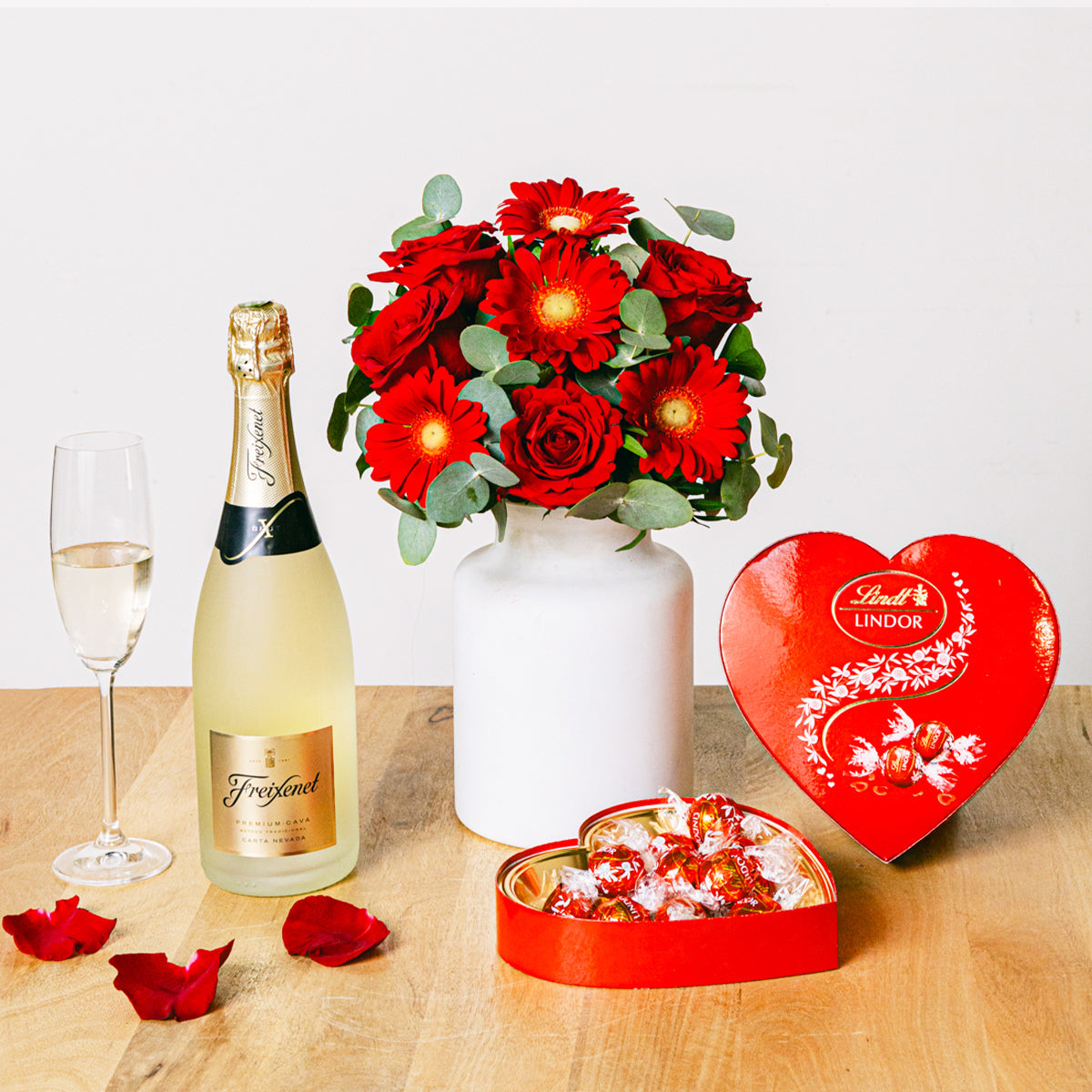 Amour en Fleurs – Bouquet de Roses et Champagne