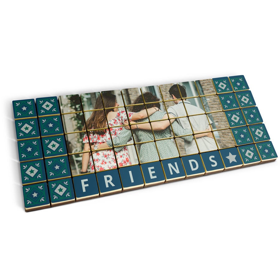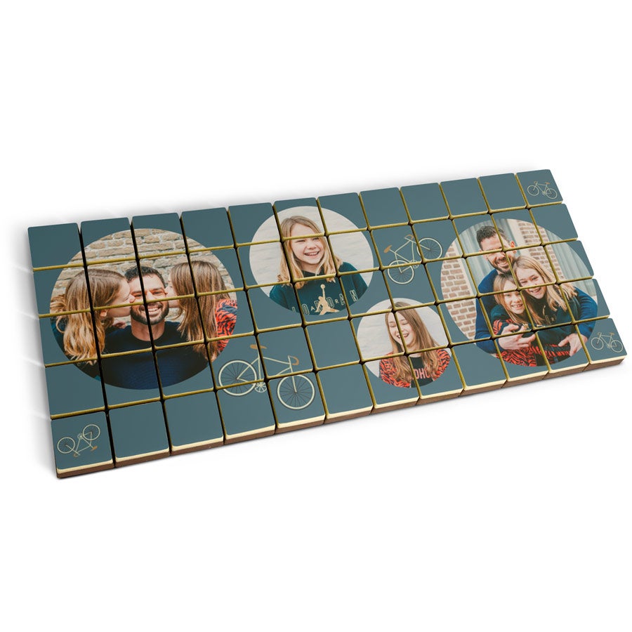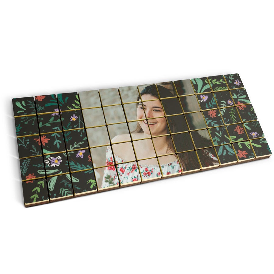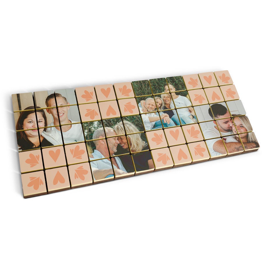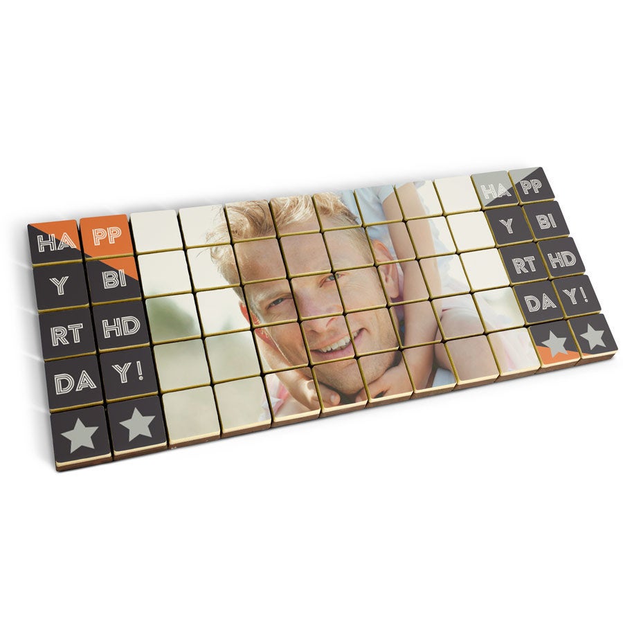 Plus d'informations sur la photo des chocolats solides :Quantité : 60 chocolatsChocolat : chocolat au lait avec une couche de chocolat blanc sur le dessusDimensions par chocolat : 2,5 x 2,5 x 1,2 cmDimensions par ensemble : 23 x 18 x 2,5 cmPersonnalisation : impression avec photo ou logoImpression : impression comestible en couleurSi les températures sont de 25 °C ou plus, nous vous conseillons d'ajouter un élément de refroidissement à votre commande. Conseils de conservation : Peut être conservé jusqu'à 10 semaines dans un endroit frais et sombre entre 14 et 18 °C. Informations allergènes : contient du soja, du lait et peut contenir des traces de fruits à coque.Ingrédients :Chocolat au lait : sucre, beurre de cacao, lait entier en poudre, pâte de cacao, émulsifiant (lécithine de soja), arôme naturel de vanille. Au moins 34 % de cacao. Chocolat blanc : sucre, beurre de cacao, lait entier en poudre, émulsifiant (lécithine de soja), arôme naturel de vanille. Au moins 29 % de cacao.