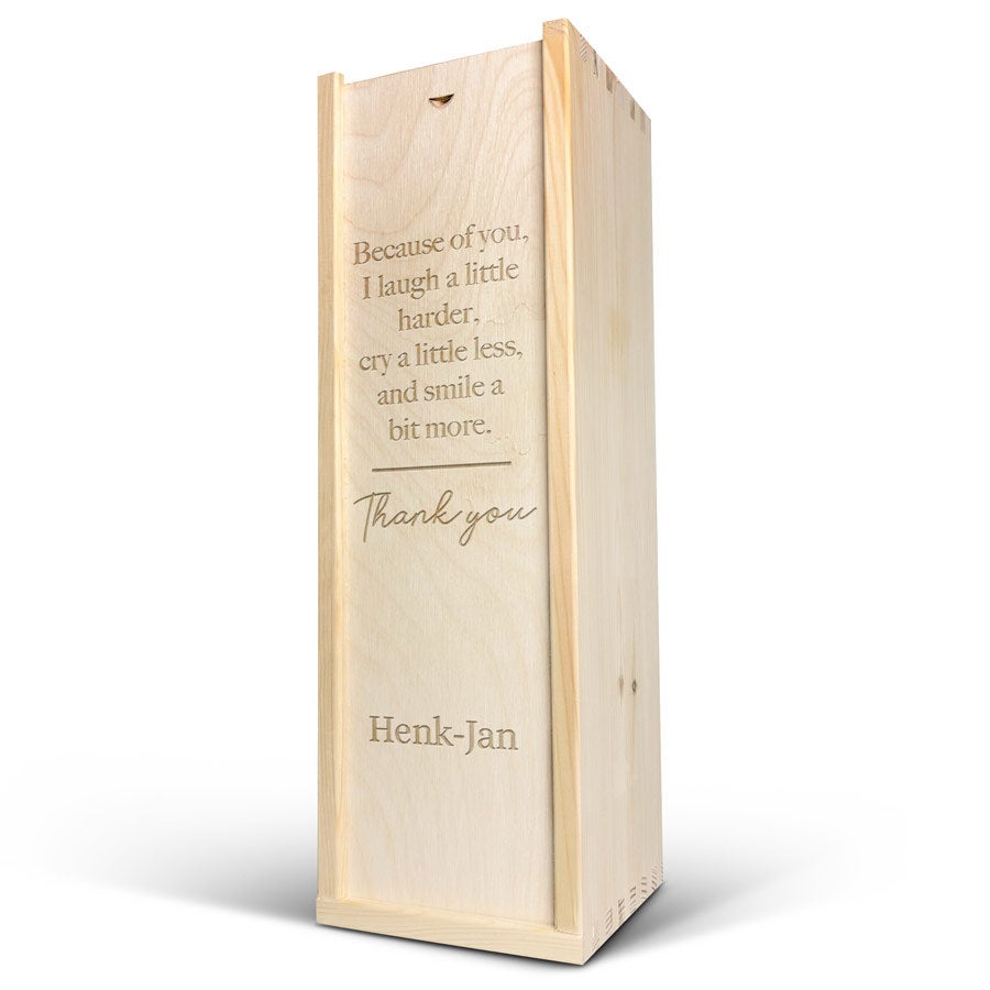Plus d'informations sur la personnalisationPersonnalisation : avec nom ou texte Méthode de personnalisation : gravure laser sur verre de haute qualité Couleur de la gravure : marron Dimensions de la boîte : 36,5 x 12 x 11 cm Extra : la boîte en bois est certifiée FSC Plus de détails sur le gin Nom : Sadler's Peaky Blinder Type de gin : dry spiced Contenu : 700 ml Pays : Angleterre Pourcentage d'alcool : 40 % Caractère : Le gin Peaky Blinder est un gin sec aux herbes et épices exotiques, comme le gingembre, le poivre noir et la cassia.