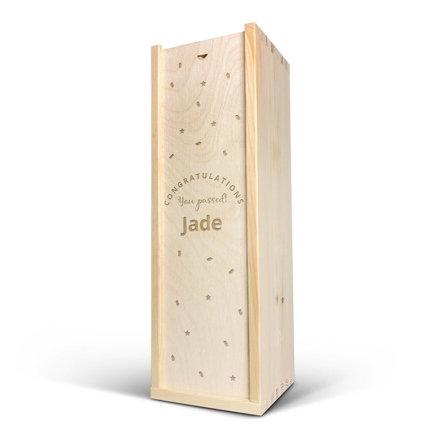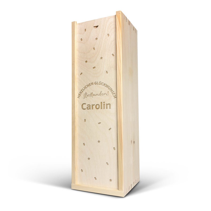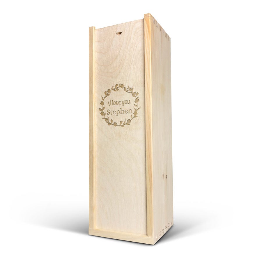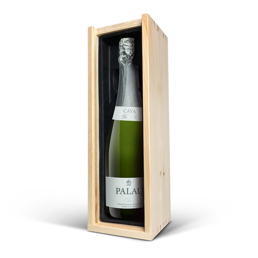Une délicieuse bouteille de cava Palau Semi-Seco dans un luxueux coffret en bois gravé de votre nom et/ou texte. Cadeau original !