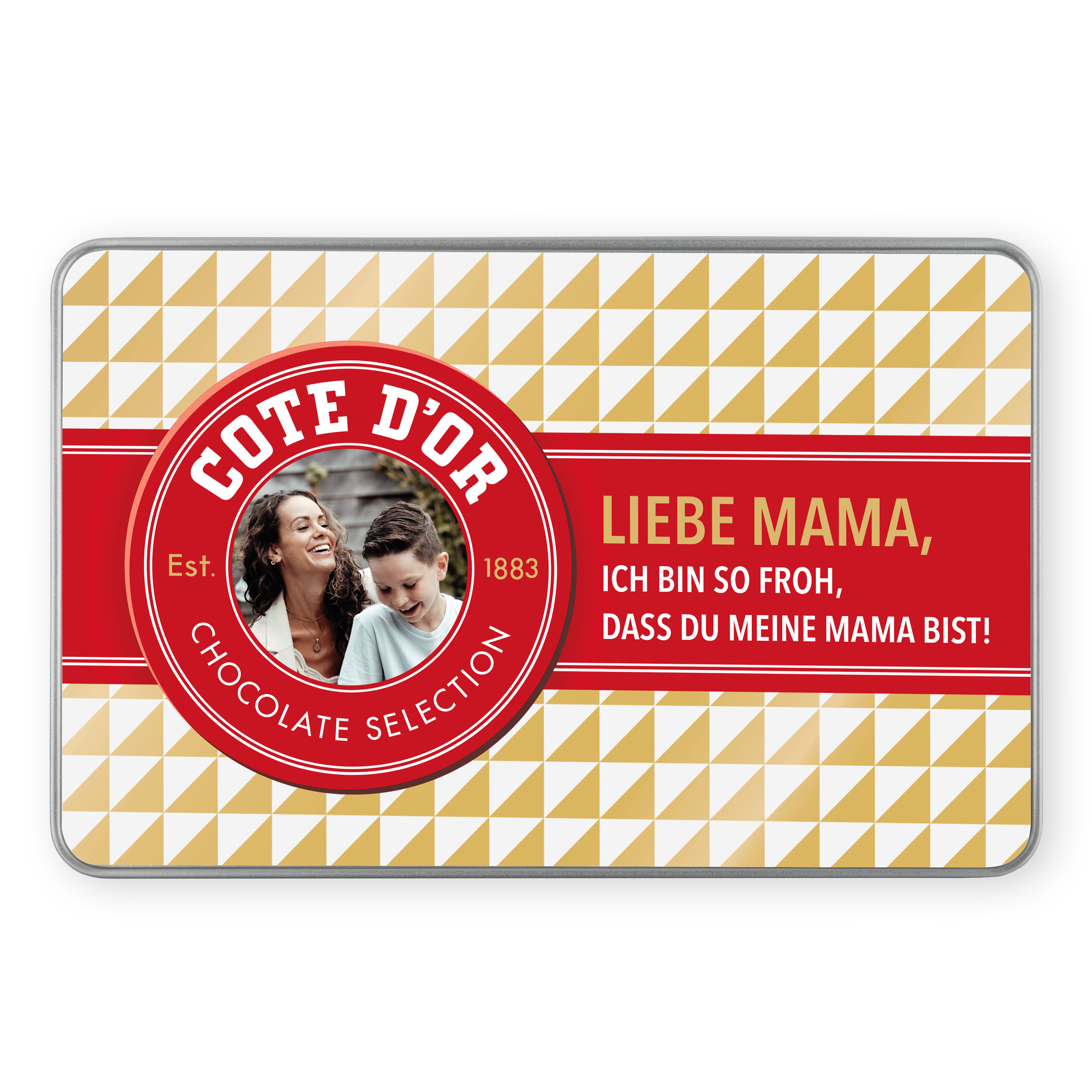 Plus d'informations sur la boîte cadeau Coffret Chocolats Côte d'Or Vintage : Forme : rectangulaire Matériau : étain Dimensions : 20 x 12,5 x 5 cm Contenu : Mignonette Lait, Mignonette Noir, Mignonette Noir Intense Poids : 320 g (32 chocolats) Personnalisation : photo et/ou texte sur une plaque photo en aluminium sur le couvercle. Veuillez noter que si la température atteint 25 °C ou plus, nous ne pouvons garantir la qualité de votre cadeau. Pour des raisons techniques, il n'est pas possible d'utiliser des caractères cyrilliques, grecs, asiatiques, arabes ou spéciaux.Ingrédients :Chocolat au lait Côte d'Or MignonetteChocolat au lait : sucre, pâte de cacao, lait écrémé en poudre, beurre de cacao, lactosérum en poudre (lait), matière grasse laitière, émulsifiant (lécithine de soja), arômes.Contient au moins 33 % de cacao. Allergènes : Lait, soja, peut contenir des fruits à coque. Chocolat noir Côte d'Or MignonetteChocolat extra noir : sucre, pâte de cacao, beurre de cacao, cacao maigre en poudre, émulsifiant (lécithine de soja), arômes, lait écrémé en poudre.Contient au moins 54 % de cacao. Allergènes : Lait, soja, peut contenir des fruits à coque.Vous trouverez plus d'informations sur les ingrédients et les valeurs nutritionnelles ici.