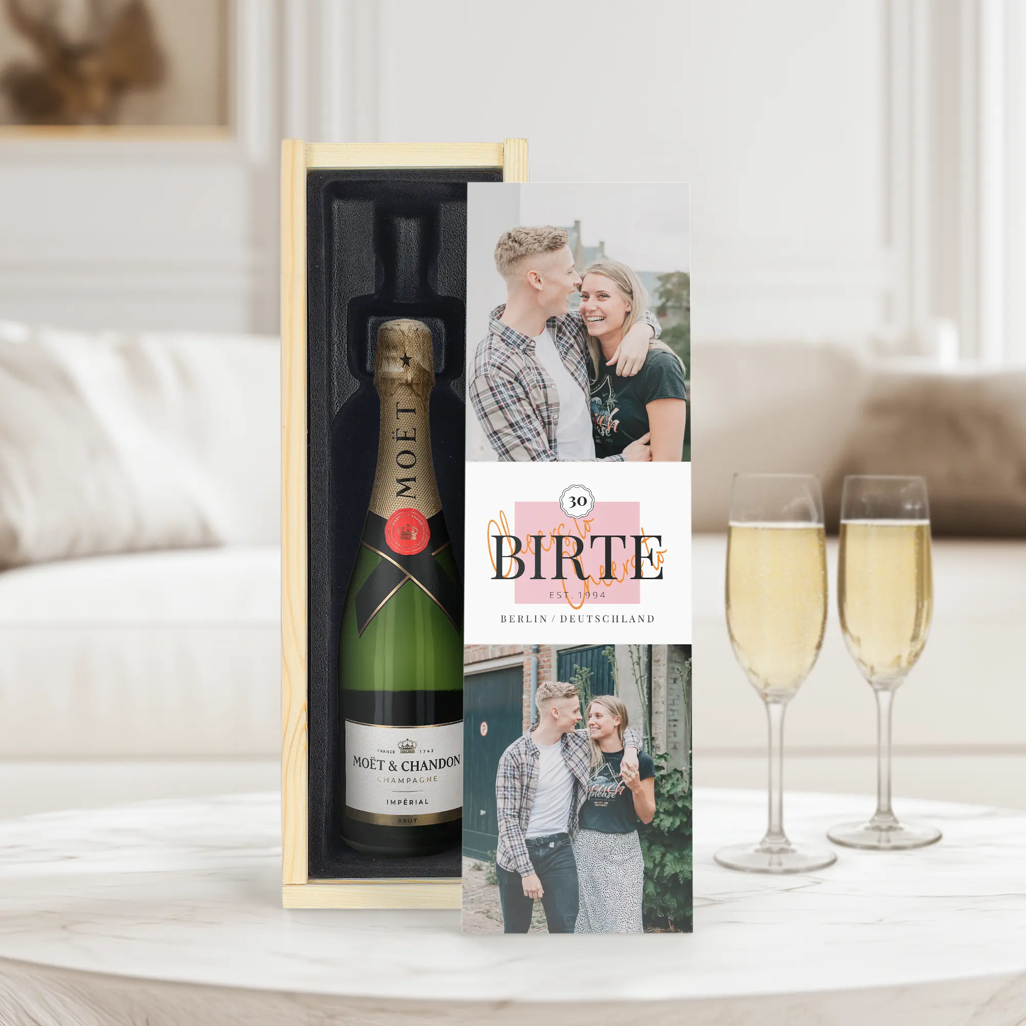 Une délicieuse bouteille de champagne Moët & Chandon dans un coffret en bois gravé à votre nom ou texte. Plusieurs formats disponibles !