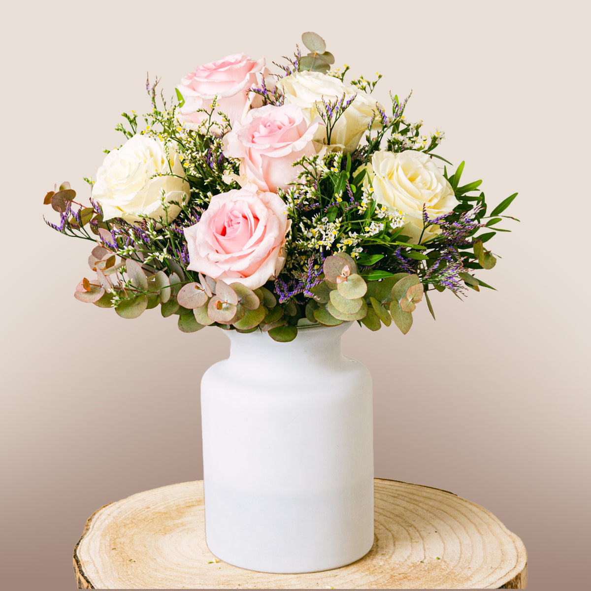 L'arôme frais de l'eucalyptus crée un bouquet purifiant qui invite chacun à respirer profondément. La composition de roses aux tons blancs et roses apaisants évoque le calme et vous invite à vous imprégner de tout ce qui vous entoure, y compris les sons subtils de votre corps qui travaille, des plantes qui poussent en harmonie avec le soleil et des oiseaux qui volent au gré du vent.
