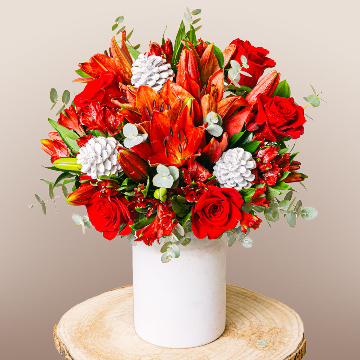 Un bouquet captivant de roses rouges veloutées, de lys rouges vibrants et de charmantes alstrœmerias, magnifiquement complété par une verdure luxuriante et des pommes de pin rustiques pour une touche festive.