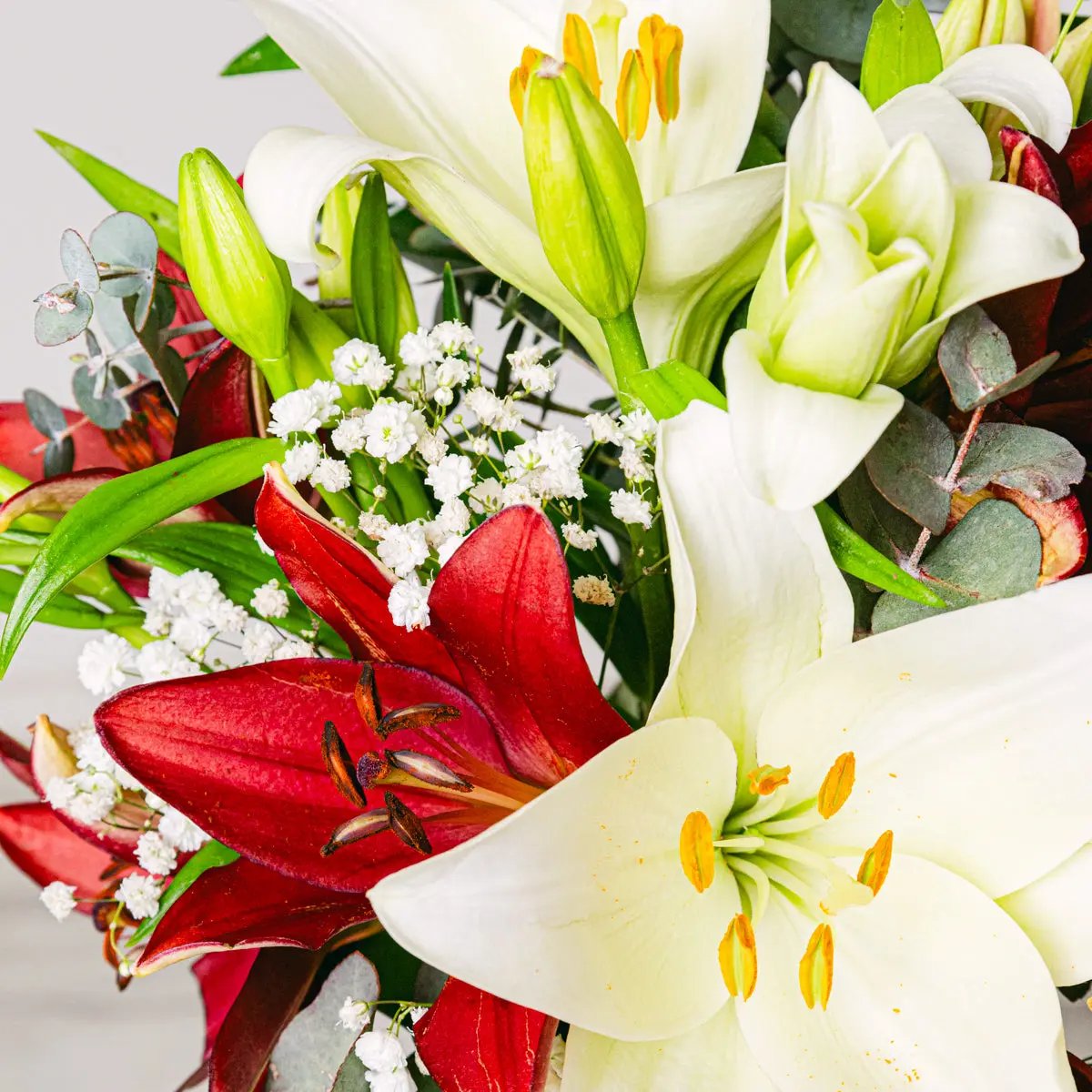 Ce bouquet allie l'élégance naturelle des lys à un design minimaliste qui met en valeur leur beauté naturelle. Chaque fleur s'ouvre en parfaite harmonie, créant un effet visuel qui transforme n'importe quel espace en un écrin de charme et de chaleur.