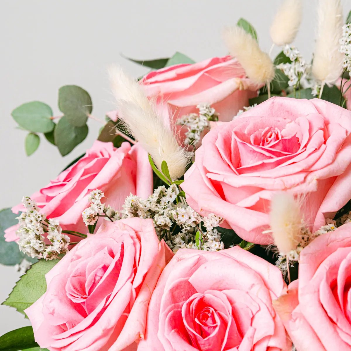 La douceur des roses roses s'allie à la pureté du limonium blanc pour créer un bouquet d'une délicatesse infinie. Un cadeau idéal pour exprimer l'affection, la gratitude et la tendresse.