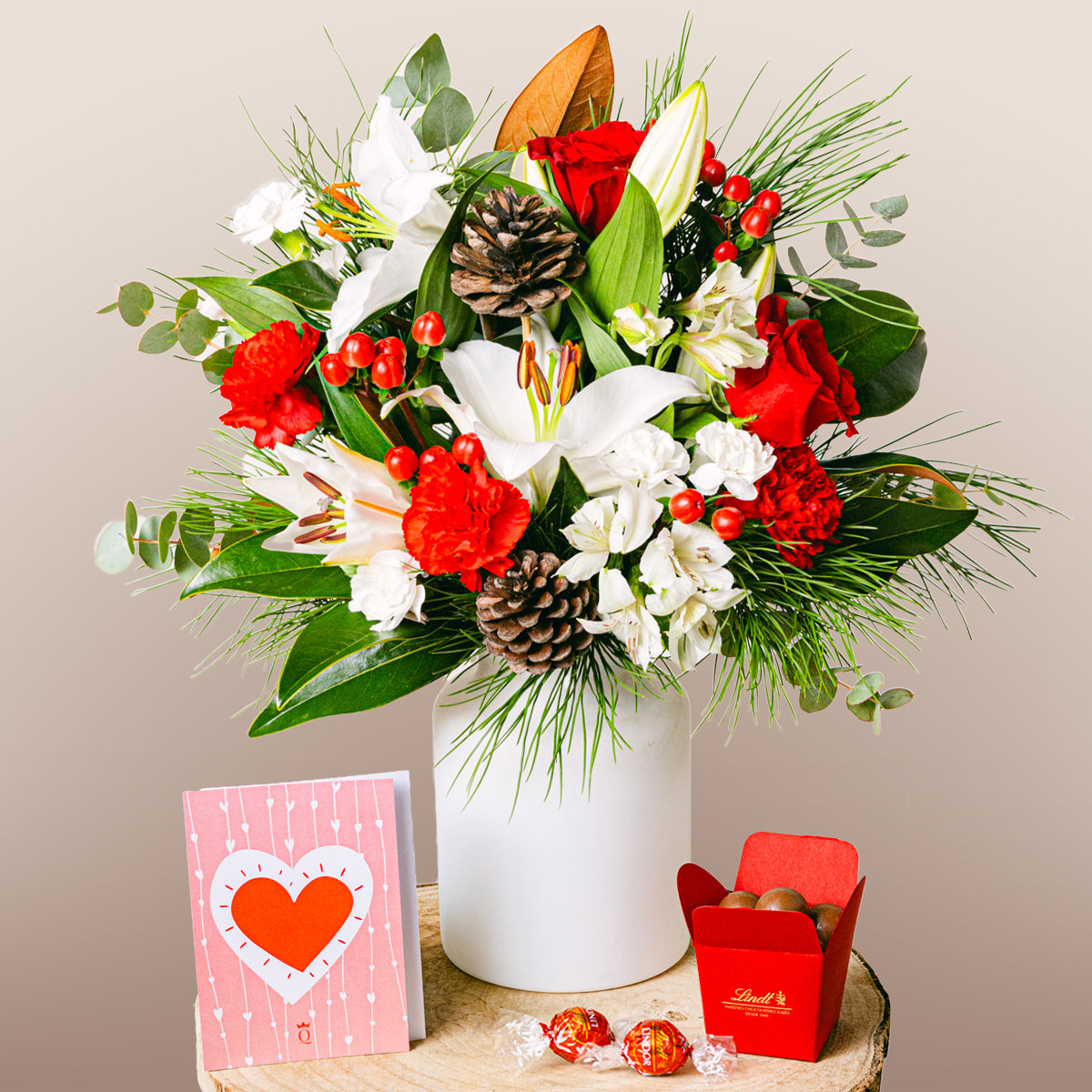 Un bouquet élégant de lys blancs, d'alstrœmerias délicates et d'œillets doux, orné de roses rouges vibrantes, de pin parfumé et de baies d'hypericum joyeuses pour une touche festive et intemporelle.