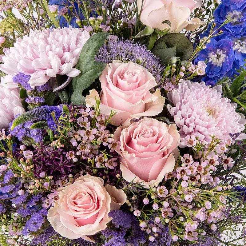 Les roses expriment l'amour et le respect, tandis que les delphiniums symbolisent l'espoir et le réconfort. Un hommage floral délicat et significatif.