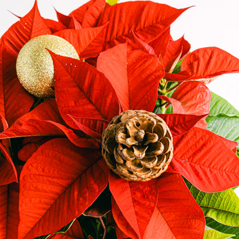 Poisencja ze swymi intensywnymi i radosnymi kolorami jest jednym z najbardziej charakterystycznych symboli Bożego Narodzenia. Nie bez powodu znana jest także jako gwiazda betlejemska. Ta poisencja udekorowana jest złote bombkami oraz świątecznymi szyszkami, dzięki czemu świetnie nadaje się na niespodziankę oraz wiadomość z bożonarodzeniowymi życzeniami.