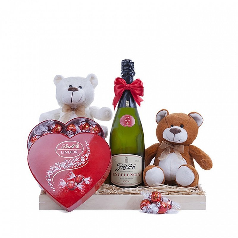 Dwa urocze pluszaki, butelka Freixenet Excelencia Brut cava, czekoladki Lindt.