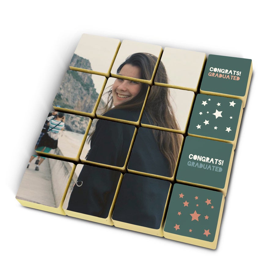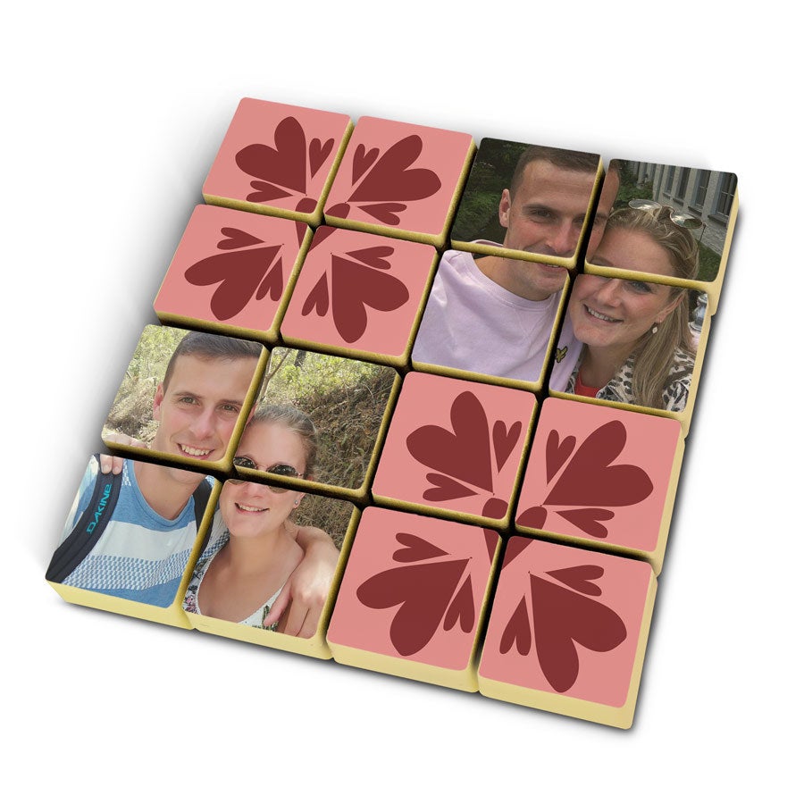 More information on the photo on chocolate pralines:Quantity: 16 chocolatesChocolate: milk chocolate with a layer of white chocolate on topFilling: pralineDimensions per chocolate: 2,6 x 2,6 x 1,2 cmDimensions per set: 23 x 18 x 2.5 cmPersonalisation: printed with photo or logoPrint: edible print in full colourWhen the outside temperature is 25 degrees Celsius or above we will not be able to guarantee the quality of the chocolate.Storage advice: Can be stored for up to 10 weeks in a cool, dark space at between 14-18°C. Allergy information: contains soy, milk and may contain traces of nuts and gluten.Ingredients:Chocolate pralines with a hazelnut filling and edible print: sugar, hazelnuts, cocoa mass, cocoa butter, full-fat powdered milk, emulsifier (soy lecithin), natural vanilla aroma.Edible print: corn starch, modified starch: E1422, potato starch, water, powdered chicken protein, skimmed milk powder, olive oil, salt, humectant E422, emulsifier: E433, colouring: E102, E110, E122: may negatively affect activity or concentration in children, E133, E151Coating: E904