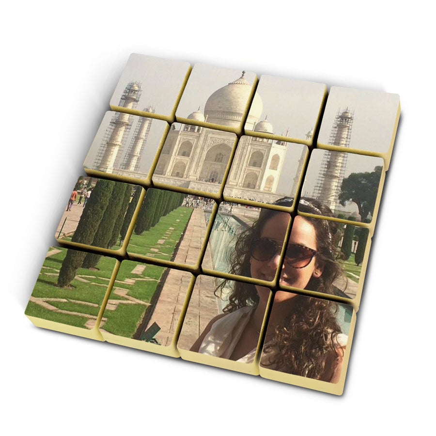Sixteen exquisite milk chocolate pralines, each with a delicate hazelnut filling and a personalized edible photo print, presented in an elegant box.