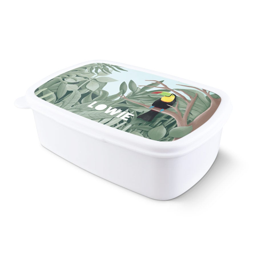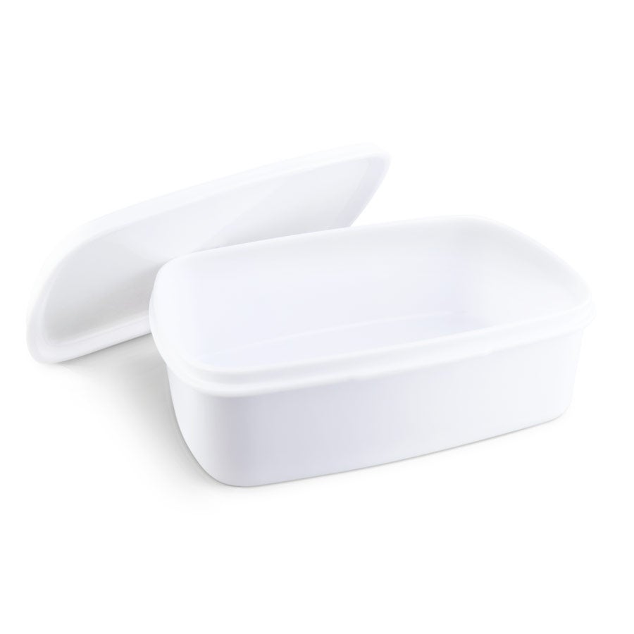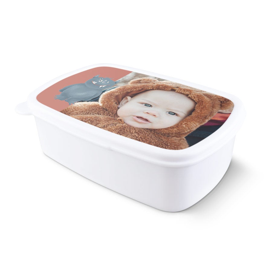 More information about the white lunch box: Colour: White Material: Plastic with aluminium photo plate Size: 18,20x12,40x5,80cm Print: Full cover on top