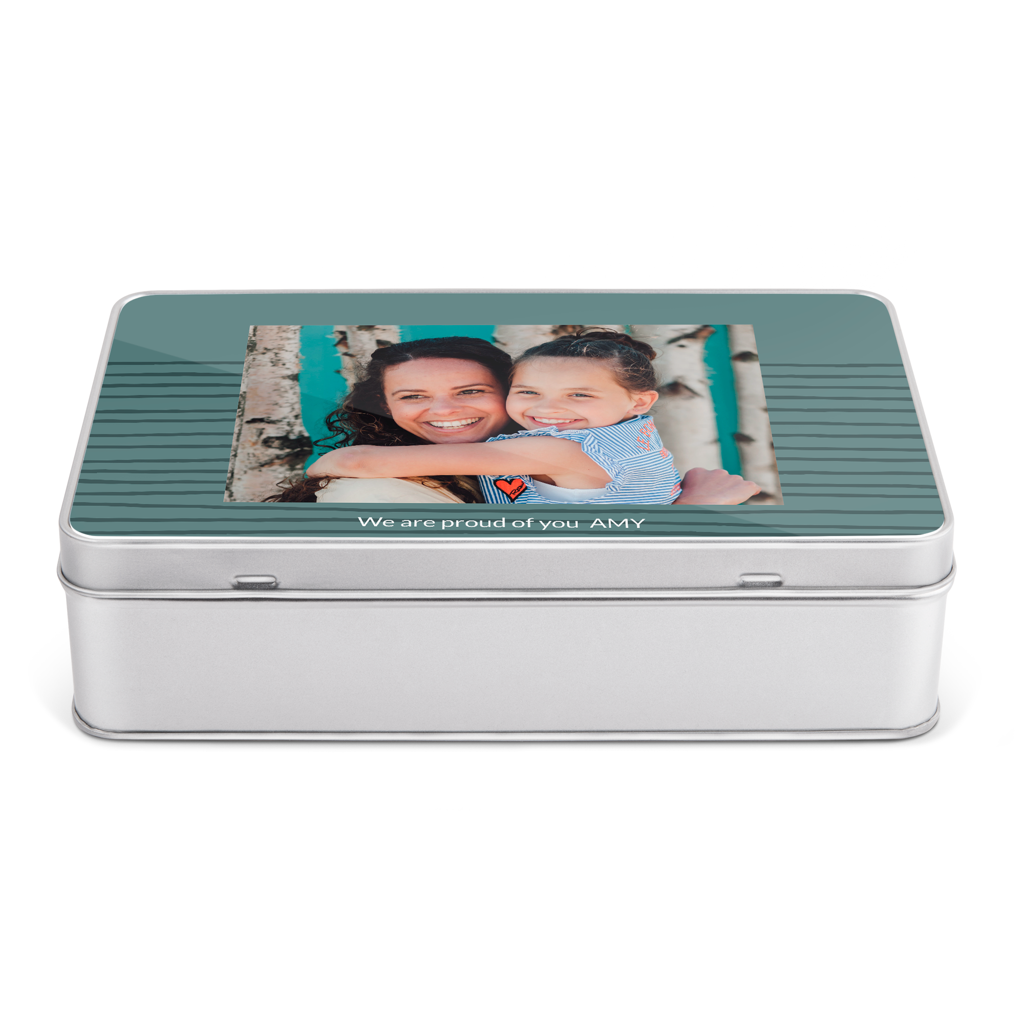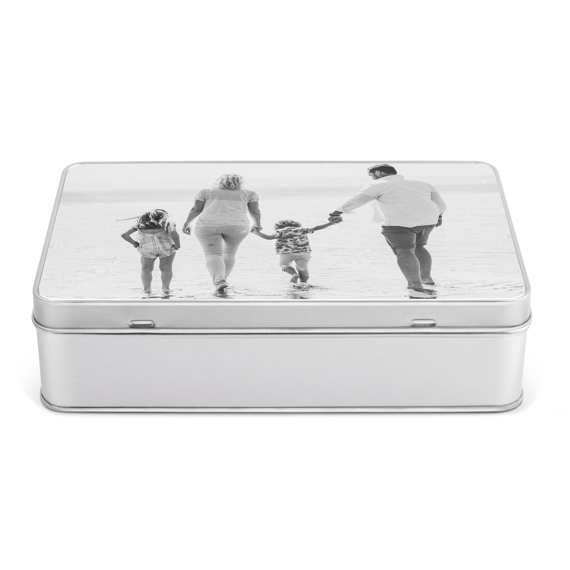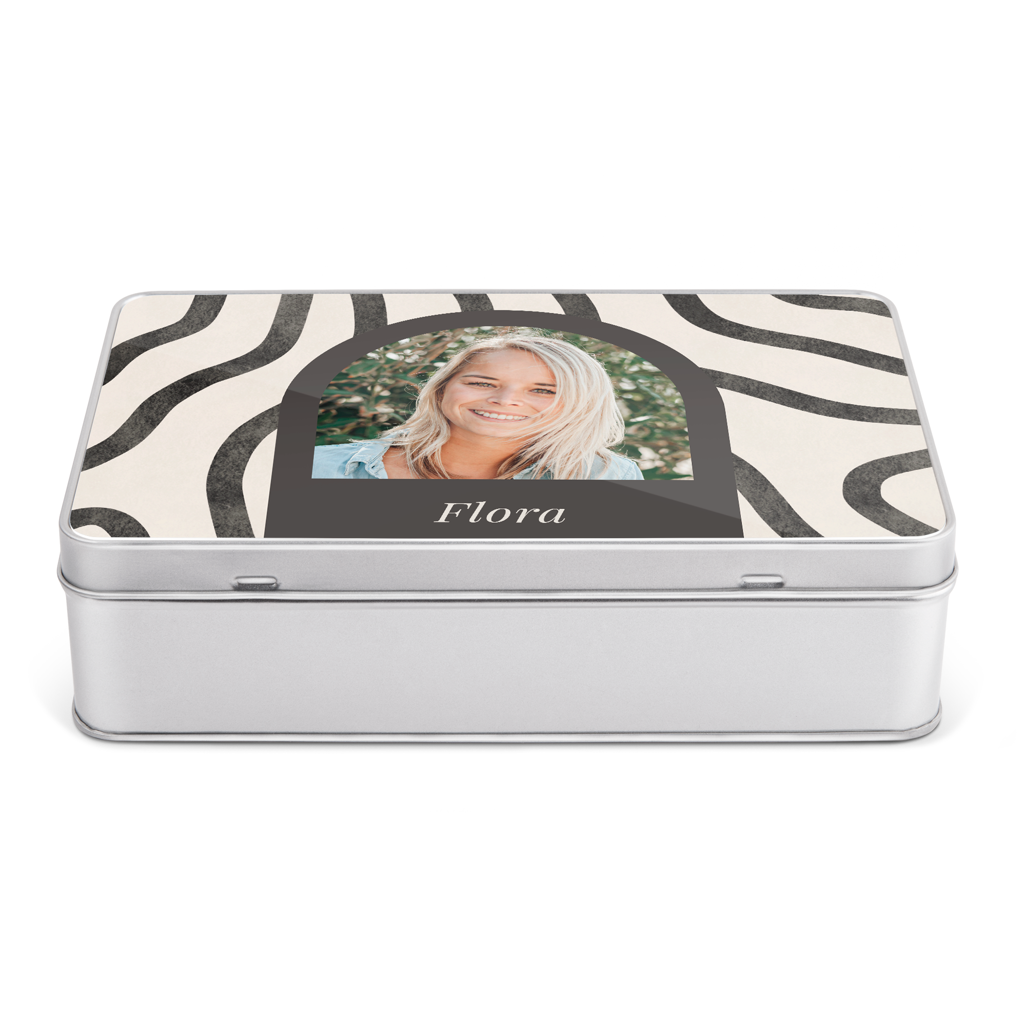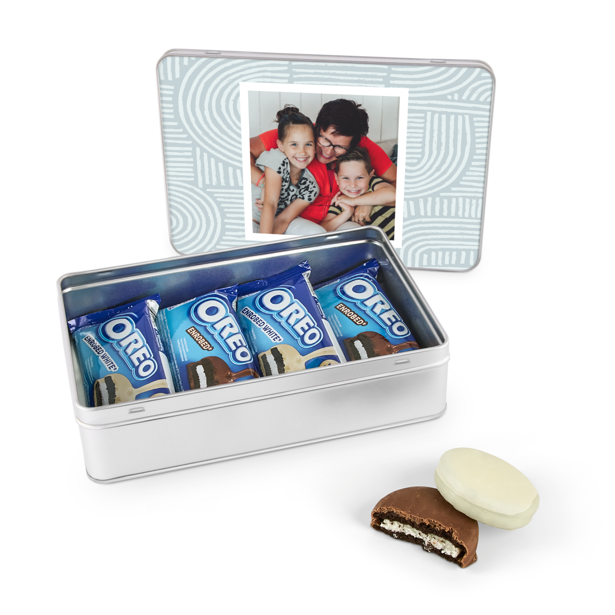Super cool storage tin with photo and/or name! Filled with delicious Oreo covered with a layer of chocolate.More information about the gift tin:Shape: rectangleMaterial: tinDimensions: 20 x 12.5 x 5 cmContents: Oreo enrobed & Oreo enrobed whiteWeight: 170 grPersonalisation: photo and/or text on aluminum plate on the lidExtra: hand wash recommendedOreo Cookies covered with milk chocolate:Ingredients : Sugar, WHEAT flour , palm oil, shea fat, skimmed cocoa powder 4.5%, rapeseed oil, skimmed MILK POWDER , WHEAT STARCH , lactose (from MILK ), glucose-fructose syrup, emulsifiers ( SOYA lecithin , E492, sunflower lecithin, E476), ammonium carbonate (potassium carbonates). , sodium carbonates), salt, flavourings.Allergens: contains milk, soy, wheat, gluten-containing grains. Cocoa biscuits (38%) with vanilla flavored filling (19%), coated with a milk chocolate flavored glaze (43%).Oreo cookies covered with white chocolate:Ingredients : Sugar, WHEAT flour , palm oil, shea fat, rapeseed oil, skimmed MILK powder, skimmed cocoa powder 2%, WHEAT STARCH , lactose (from MILK ), whey powder (from MILK ), glucose-fructose syrup, MILK FAT , emulsifiers ( SOYA lecithin), sunflower lecithin, E492, raising agents. (potassium carbonates, ammonium carbonates, sodium carbonates), salt, flavors. Cocoa biscuits (38%) with vanilla flavored filling (19%), coated with a glaze (43%) with white chocolate flavor.Allergens: contains milk, soy, wheat, gluten-containing grains.Unfortunately, at tropical temperatures above 25 degrees, we cannot guarantee that you will receive your chocolate gift in perfect condition. Any questions? Please contact our customer service.Unfortunately, for technical reasons, it is not possible to print numbers, Cyrillic, Turkish or special characters.