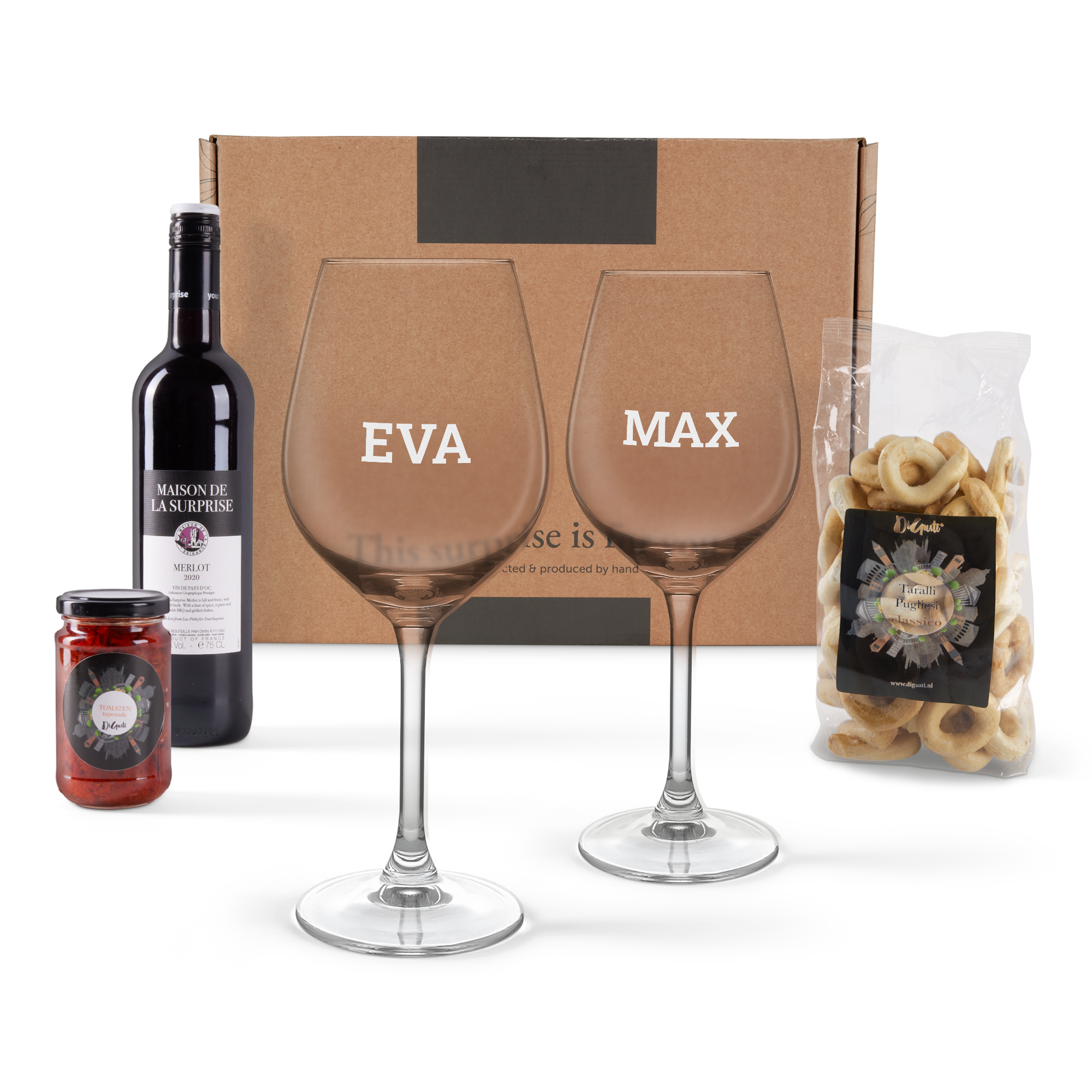 More information on the wine & snacks gift set:Includes: crackers (350 grams), tomato tapenade (212 ml), bottle of Maison de la Surprise Merlot, two personalised wine glassesGift box dimensions: 39 x 30 x 11.5 cmMore information on the red wine glasses:Quantity: 2Brand: Royal LeerdamType: L'EspritDiameter: 8.5 cmHeight: 20.5 cmWeight: 180 gramsCapacity: 37 clPersonalisation: name or textPersonalisation method: high-quality laser engravingEngraving colour: white, so your gift may differ slightly from the preview imageAdditional information: the glasses can be personalised individually and are dishwasher safeMore information on the wine:Brand: Maison de la Surprise MerlotType of wine: red, smooth and fruityContents: 750 mlCountry of origin: FranceGrape variety: merlotCharacter: Maison de la Surprise Merlot has intense notes of black fruit and a hint of vanilla. Excellent with poultry and roasted meatsIngredients tomato tapenade (DiGusti): sun-dried tomatoes, sunflower oil, salt, vinegar (sulphites), garlic, aromas.Ingredients crackers (DiGusti): flour type ''0'', white wine, sunflower oil, extra virgin olive oil, salt.Allergens: Contains cereals with gluten and sulphites. May contain traces of sesame seeds.