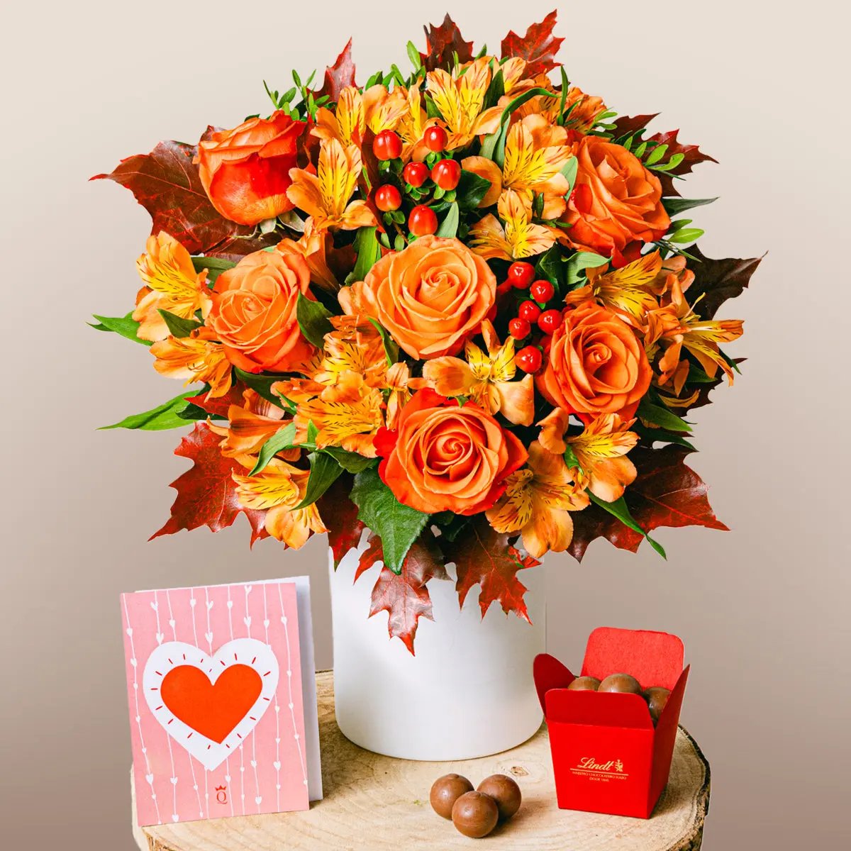 This bouquet features orange roses and alstroemerias, complemented by oak leaves and hypericum berries. The vibrant orange and yellow hues evoke the warmth and beauty of autumn.