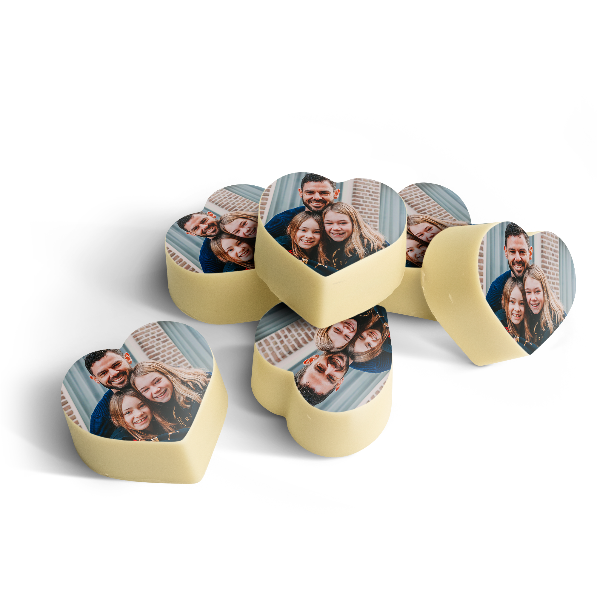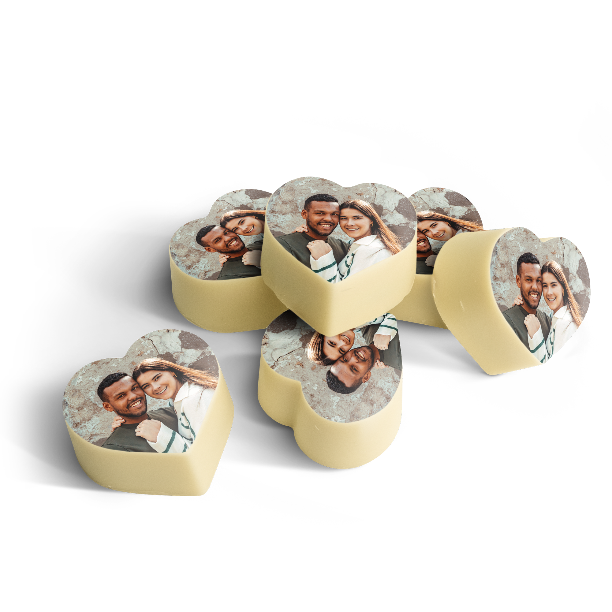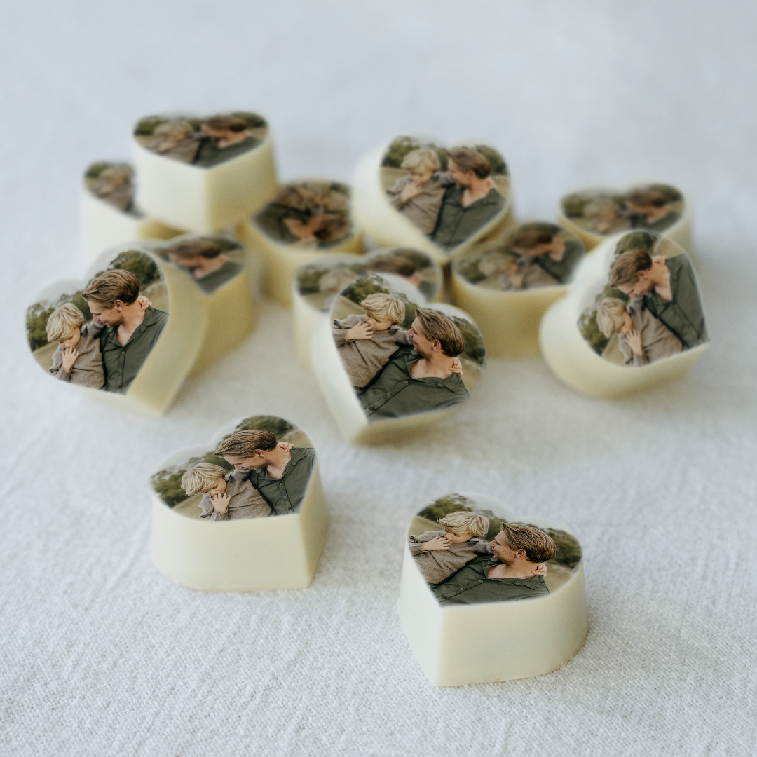 Mais informações sobre os bombons de chocolate em forma de coração personalizados:Quantidade: conjunto de 12 chocolatesChocolate: chocolate ao leite com uma camada de chocolate branco por cimaFormato: em forma de coraçãoDimensões por chocolate: 2,7 x 1,6 cm, pode variar ligeiramente por chocolateRecheio: pralinePersonalização: impresso com foto ou logotipoImpressão: impressão comestível em cores vivasQuando a temperatura externa estiver acima de 25 graus Celsius, não poderemos garantir a qualidade do chocolate.Importante: Não é possível usar fotos diferentes para cada chocolate individualConservação: Pode ser armazenado por até 10 semanas em um local fresco e escuro, entre 14-18°C. Informações sobre alergias: contém soja, leite e pode conter traços de nozes e glúten.Ingredientes:Bombons de chocolate com recheio de avelã e impressão comestível: açúcar, avelãs, massa de cacau, manteiga de cacau, leite em pó integral, emulsificante (lecitina de soja), aroma natural de baunilha.Impressão comestível: amido de milho, amido modificado: E1422, amido de batata, água, proteína de frango em pó, leite em pó desnatado, azeite, sal, umectante E422, emulsificante: E433, corante: E102, E110, E122: pode afetar negativamente a atividade ou concentração em crianças, E133, E151Cobertura: E904
